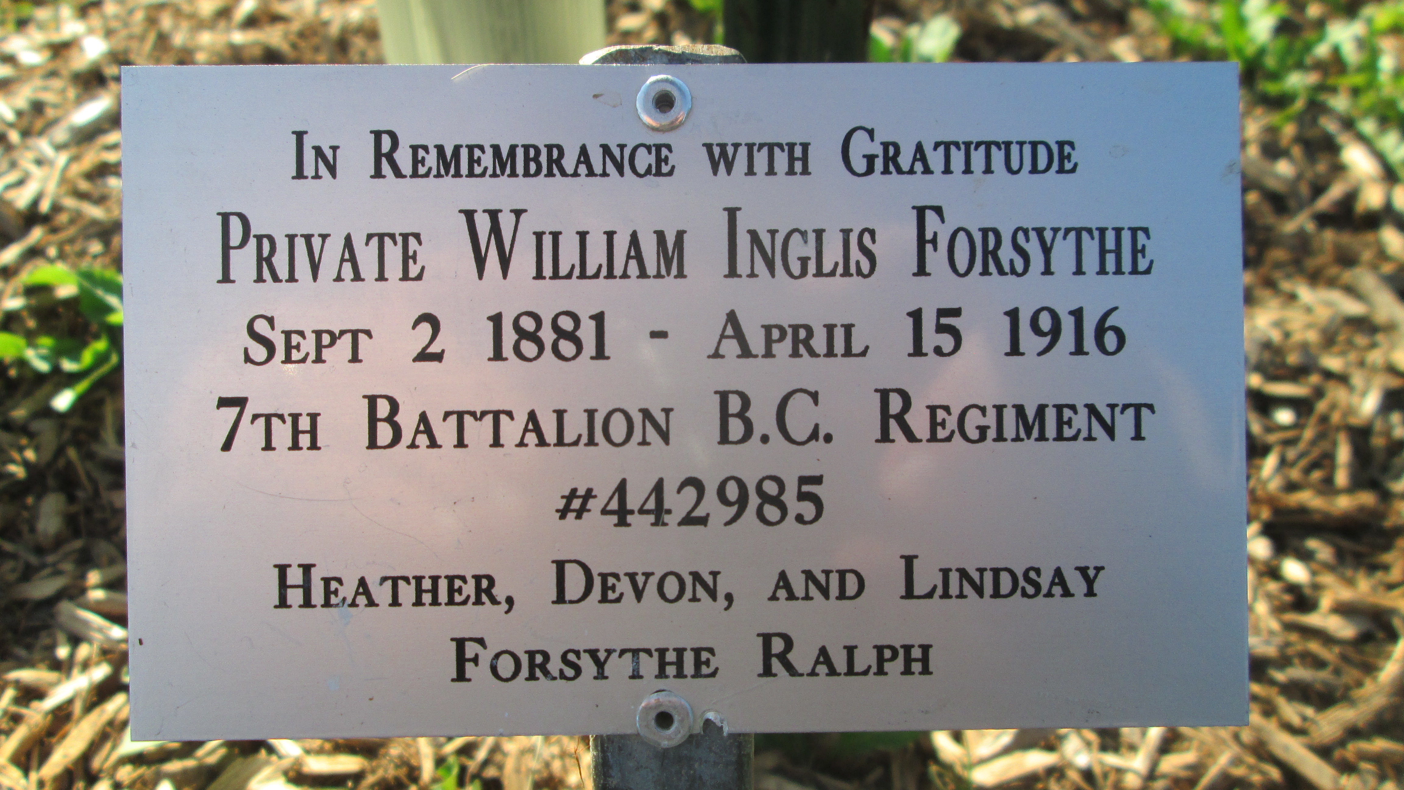 This memorial tree was planted in memory of Private William Inglis Forsythe who was killed during the First World War.