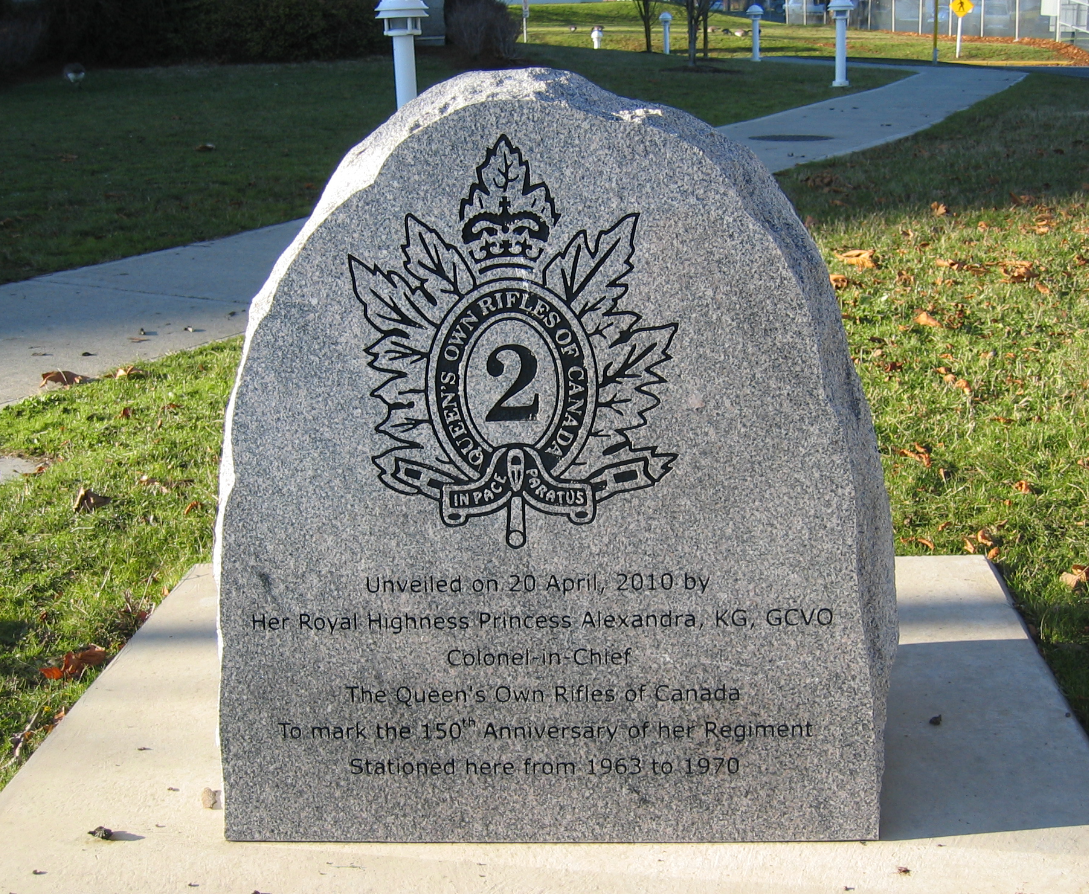 This memorial symbolizes the dedication and sacrifice of soldiers of the regiment in war and peace. It reflects the affection, admiration and appreciation of all riflemen of The Queen’s Own Rifles of Canada for their service to the regiment and to Canada of their Colonel-in-Chief, Her Royal Highness, Princess Alexandra, KG, GCVO. They celebrated her 50 years as their Colonel-in-Chief as well as their 150th birthday.