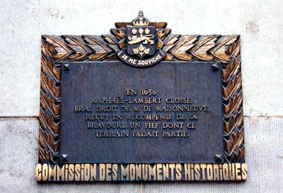 This memorial commemorates the gift of land that Raphaël-Lambert Closse received from M. de Maisonneuve. It was erected by the Quebec Historical Monuments Commission.
