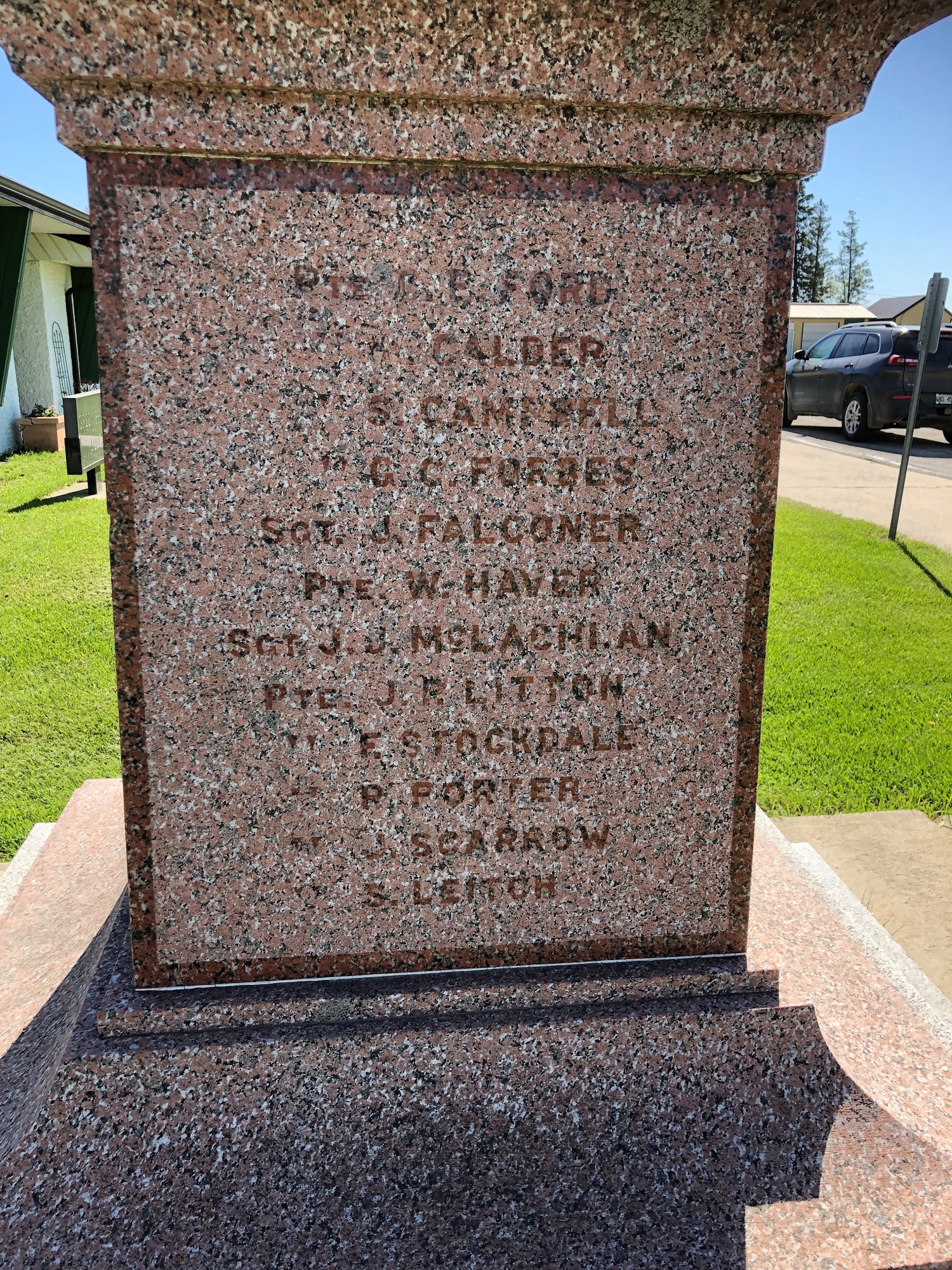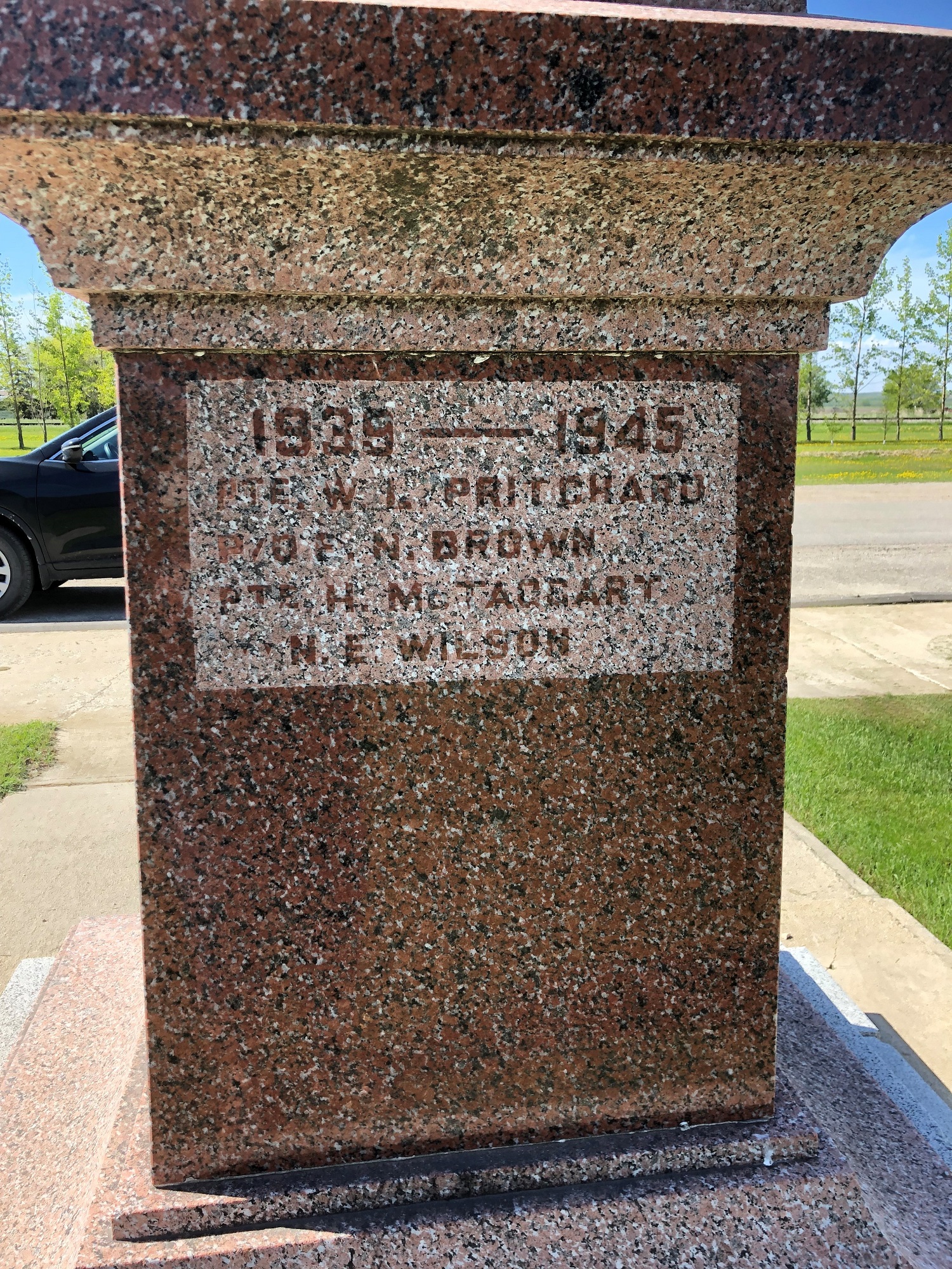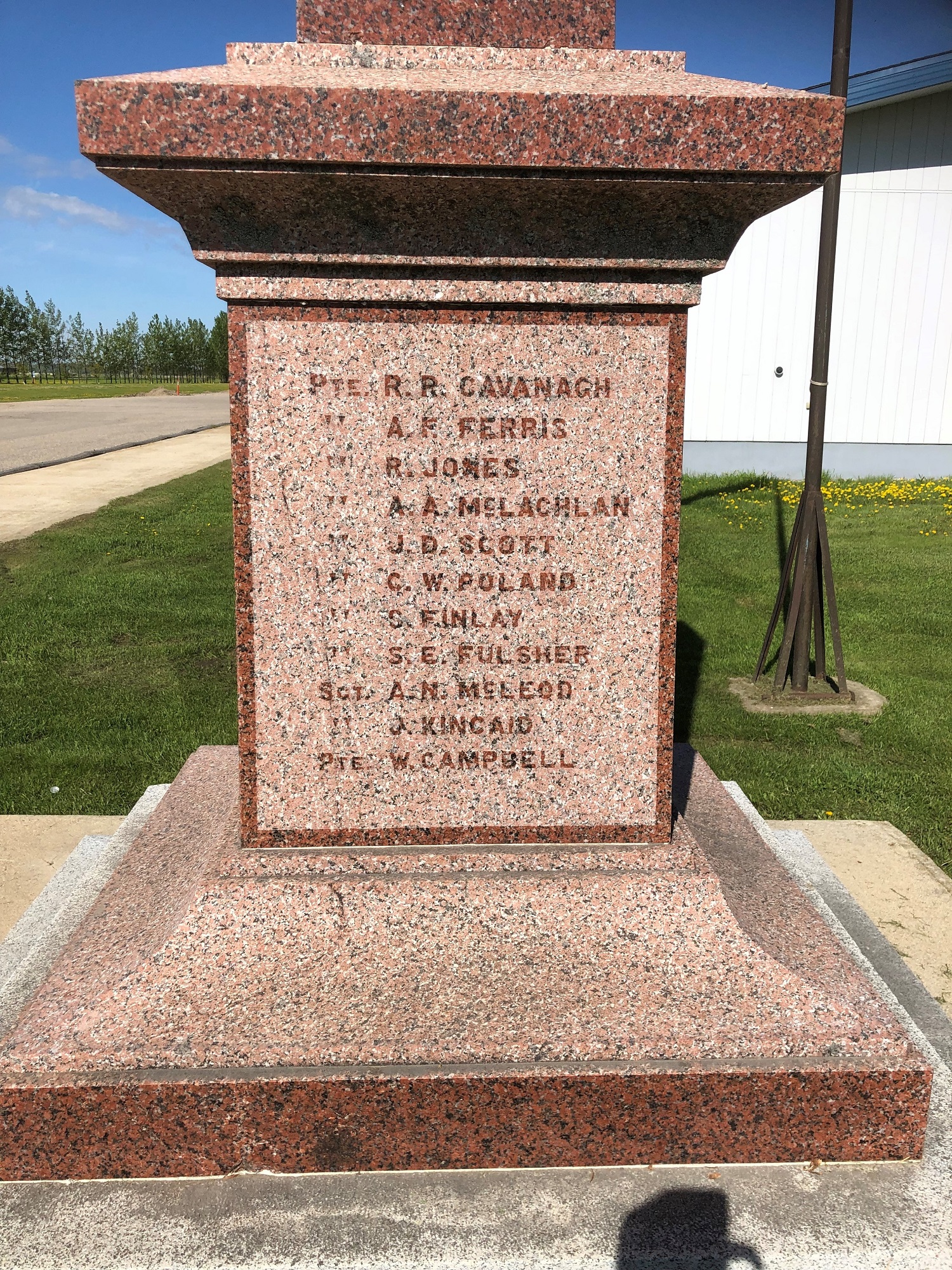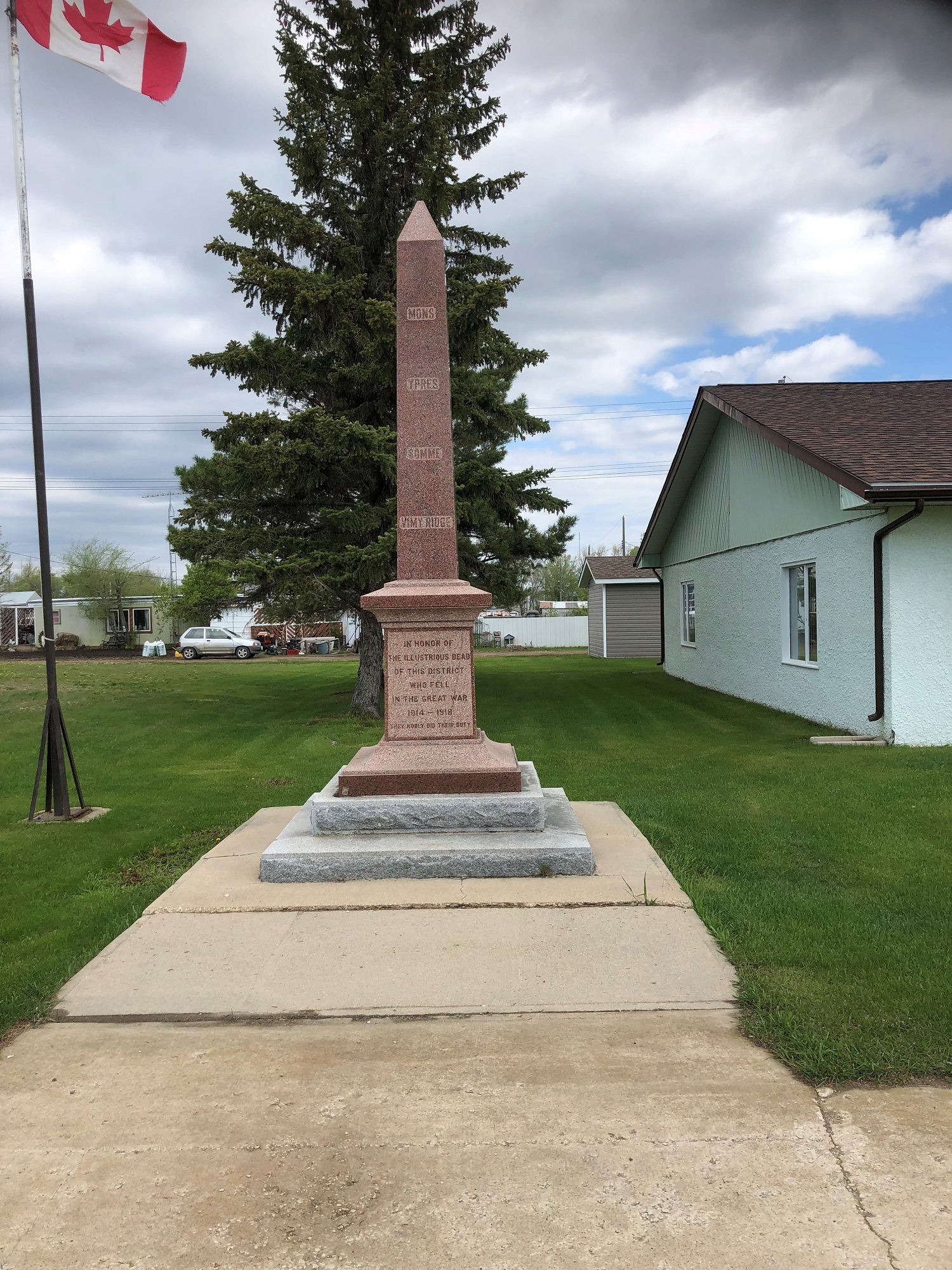 One of the first boys from Rathwell to volunteer and also the first to fall in the First World War was C. E. Ford. The girls of the district formed the Girls' Khaki Club and sent parcels overseas to all the Rathwell boys every Christmas and Easter. The club held teas, pancake suppers, and with the help of the community gathered scrap iron which was loaded in boxcars and shipped to Winnipeg to be sold. This money raised from the sale of scrap iron was used to erect the cenotaph. After the First World War was over and the boys returned from overseas, the Girls' Khaki Club had a banquet for them and presented them each with tie pins.
