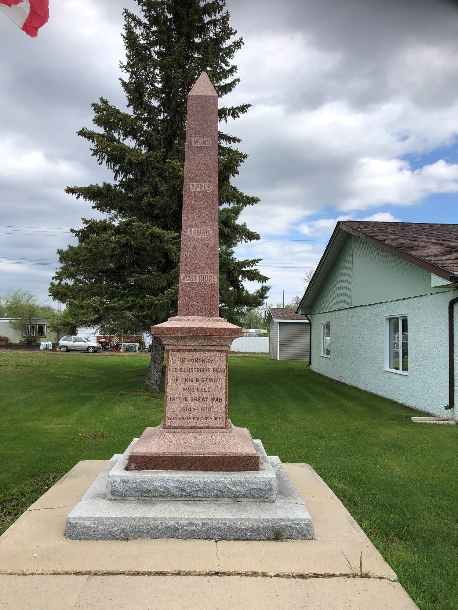 The cenotaph was unveiled on 1 October 1921 by the Lieutenant-Governor of Manitoba, Sir James Aikens. It is mounted on two rough-edged limestone steps, with the base curved to form a transition to the plinth. Originally dedicated to the local war dead of the First World War, it was expanded to incorporate a dedication to the local losses of the Second World War.