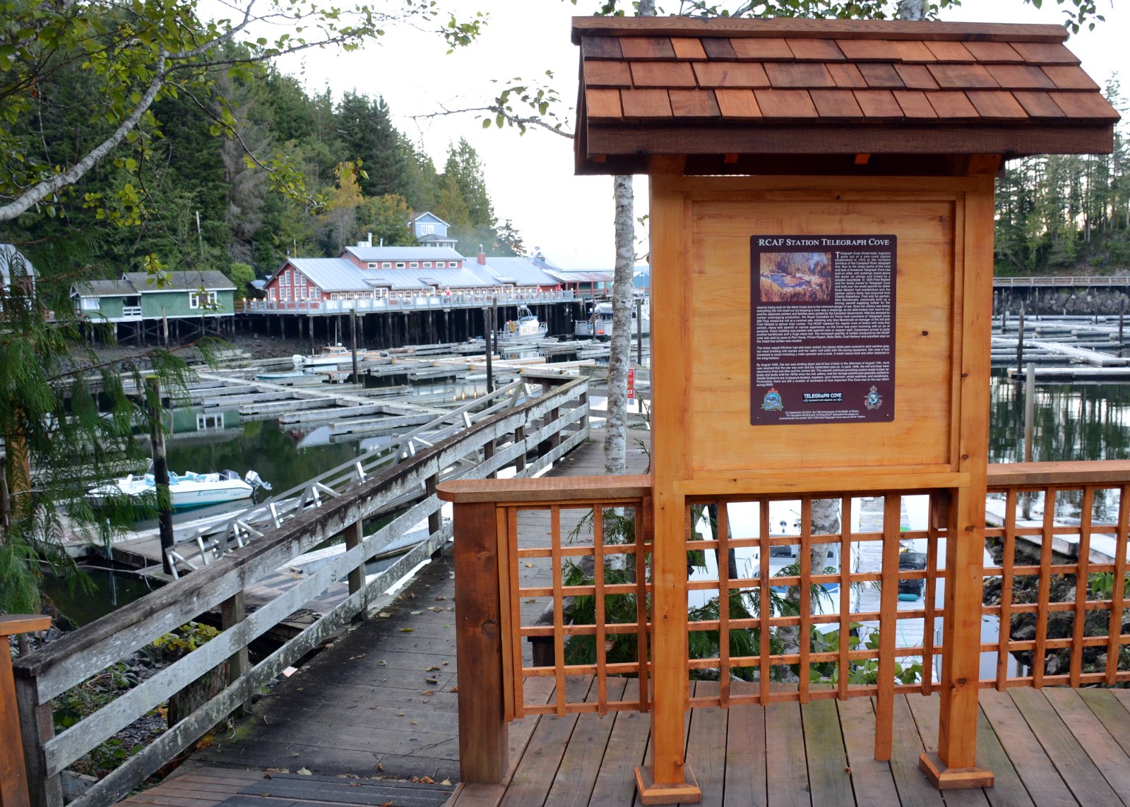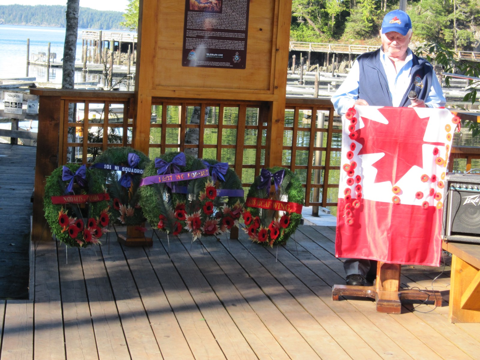The high-performance Laminate on Dibond plaque is attached to a wooden background. An RCAF flag flies beside it. Telegraph Cove Resort owner Gordie Graham built the wooden support frame and installed the flag on a viewing platform beside the boat launch in late summer of 2015.