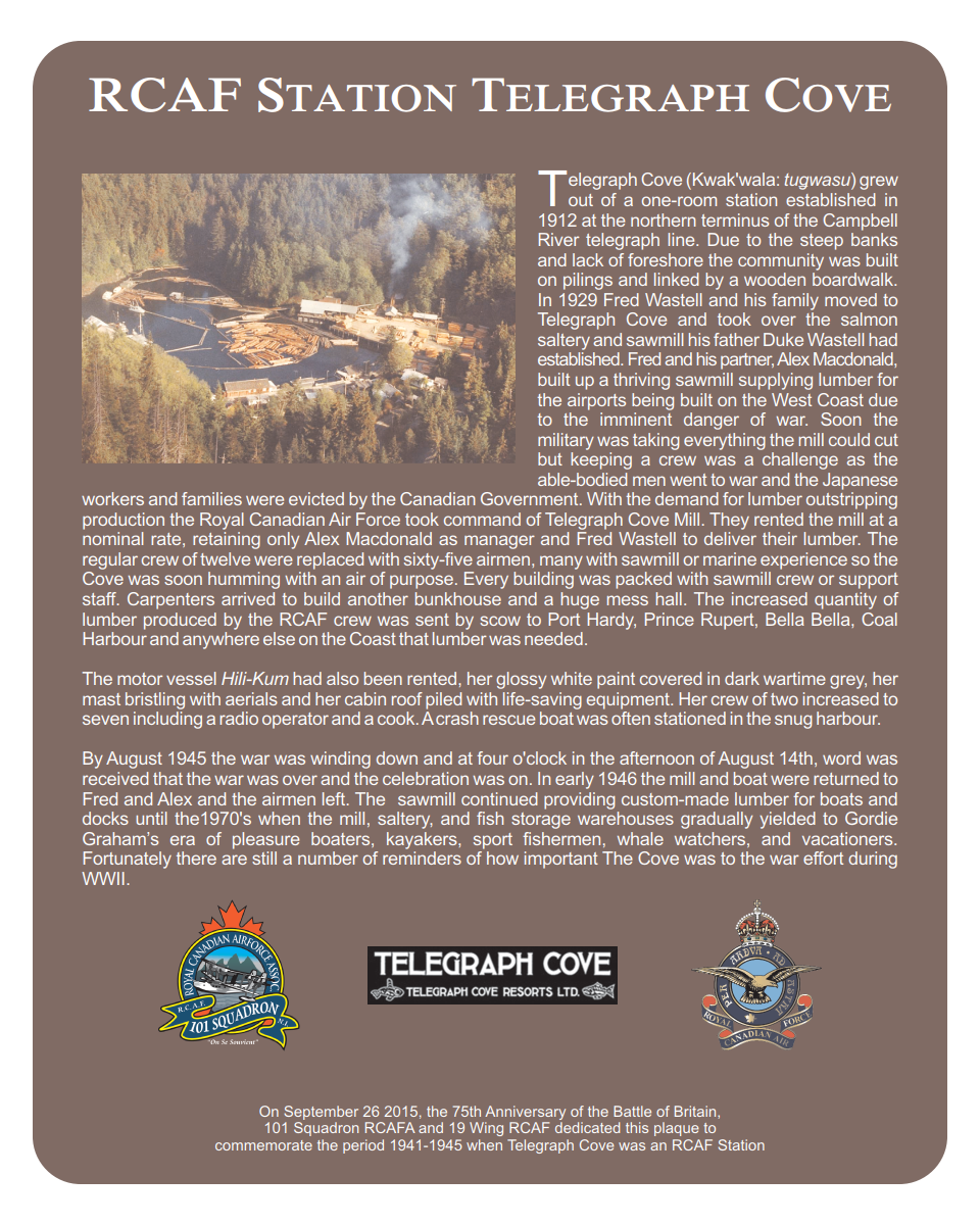 On 26 September 2015, the 75th Anniversary of the Battle of Britain, 101 Squadron RCAFA and 19 Wing RCAF dedicated this plaque commemorating the period, 1941-45, that Telegraph Cove was an RCAF Station. It was a picture-perfect fall day. LCol Gilles Couture, 19 Wing OpsO, was the RCAF representative. There were numerous other guests from 19 Wing, 888 Wing, and 101 Squadron. 101 fielded a full colour party, an MC and a bugler.