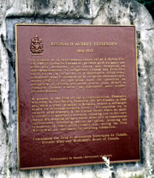 This plaque, erected in 1983, is dedicated to the memory of Reginald Aubrey Fessenden of Bolton-East who was a researcher, inventor and pioneer in telephone reception. During the First World War, he invented an instrument to locate submarines.