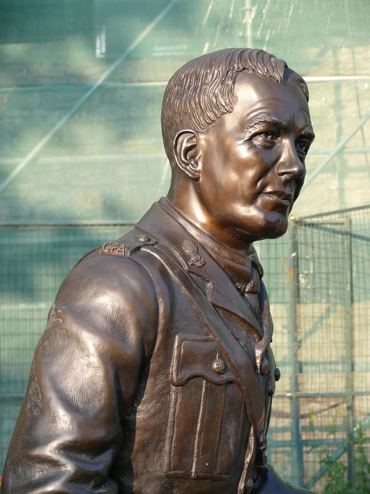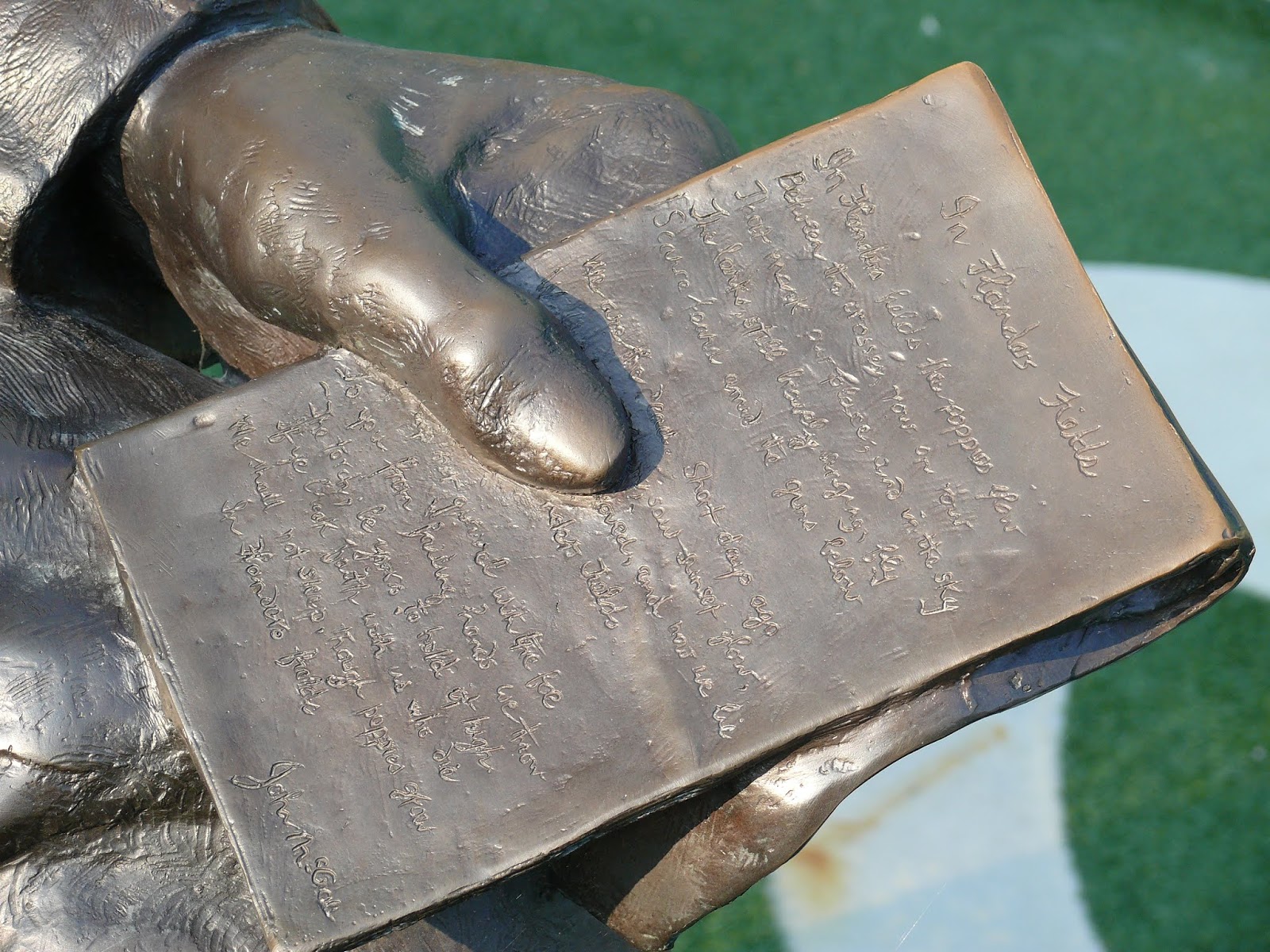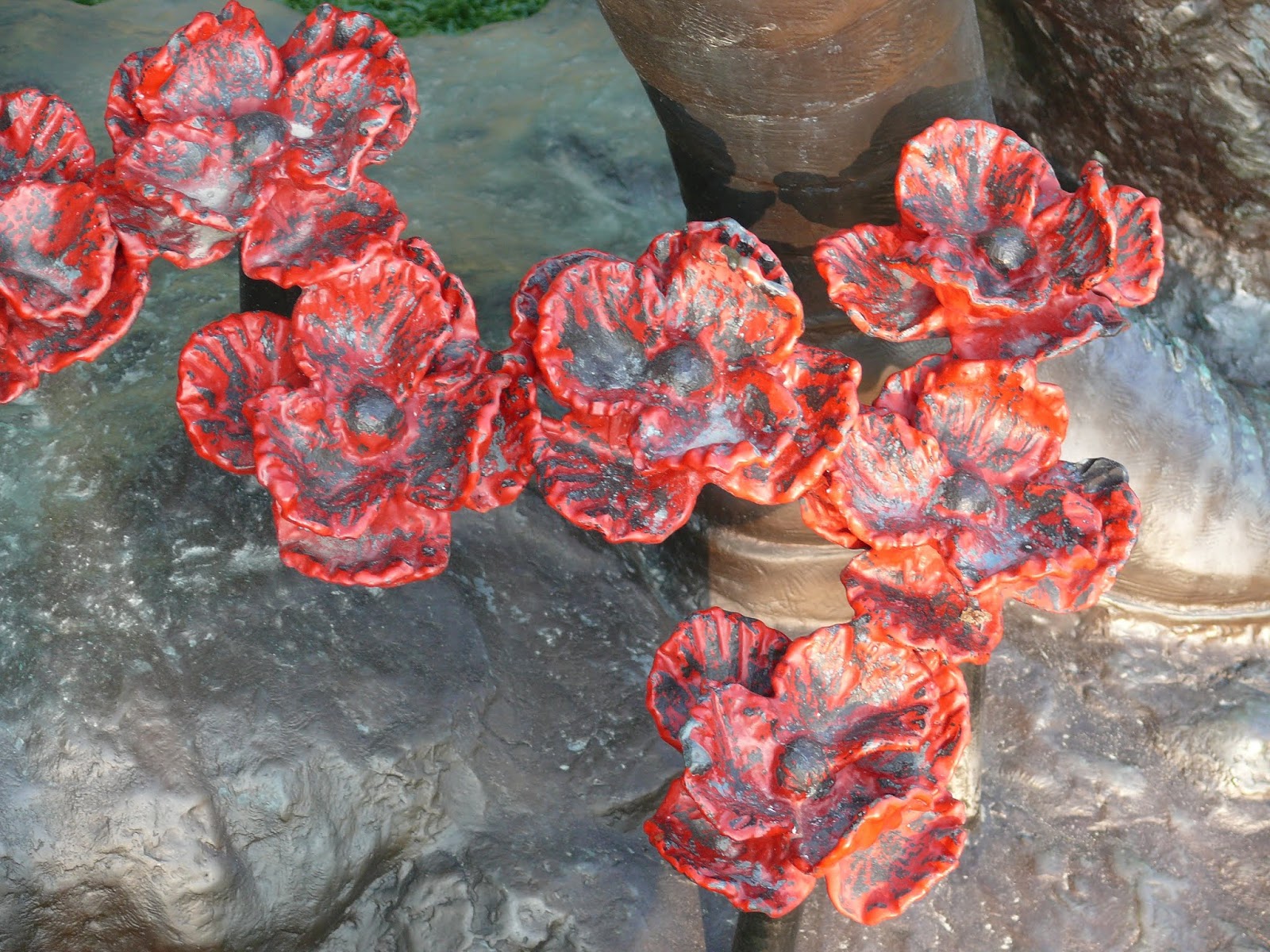 The Remember Flanders memorial in Guelph (and Ottawa) were designed by Canadian sculptor Ruth Abernethy. The hand-sculpted figure and the log on which McCrae is seated were sculpted as one piece. The two ends of the log and the base of rock and dirt were sculpted in another studio. Ruth was assisted by Cassie Koch and Lynette Schlichting who worked on the trees and base.