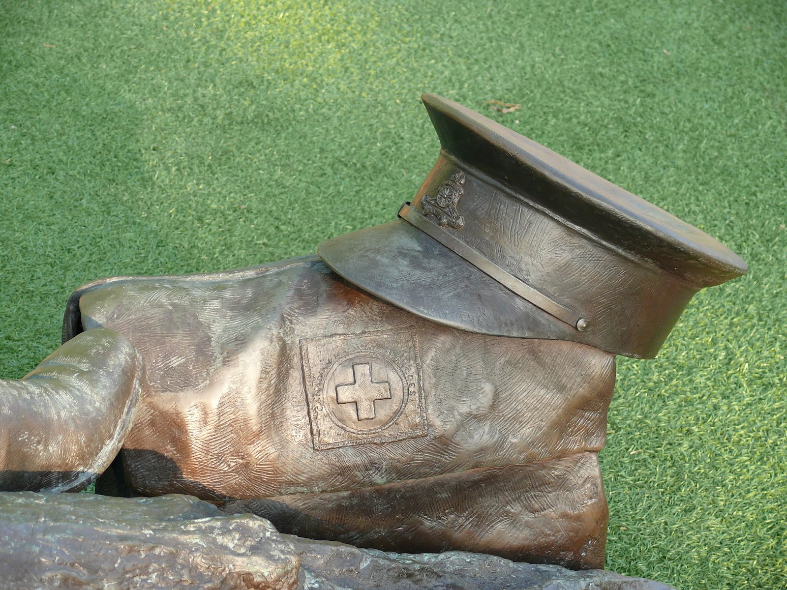 The crested buttons, the cap badge and uniform details are specific to John McCrae, 1915. As he writes with a notepad in hand, his medical bag is nearby and at his feet are poppies representing each of Canada's 23 regiments. In part because of the poem's popularity, the poppy was adopted as the Flower of Remembrance for the war dead of Britain, France, the United States, Canada and other Commonwealth countries.