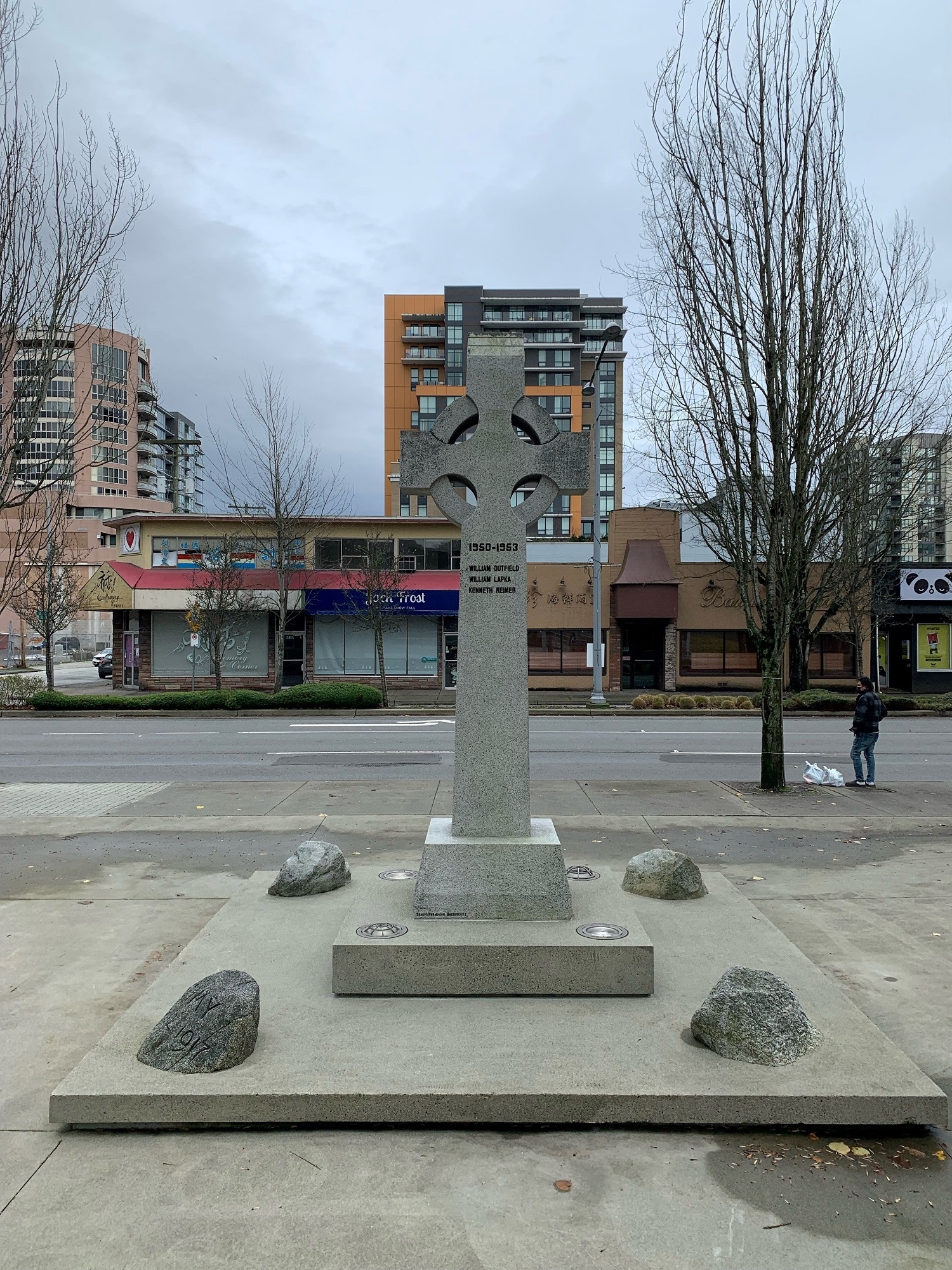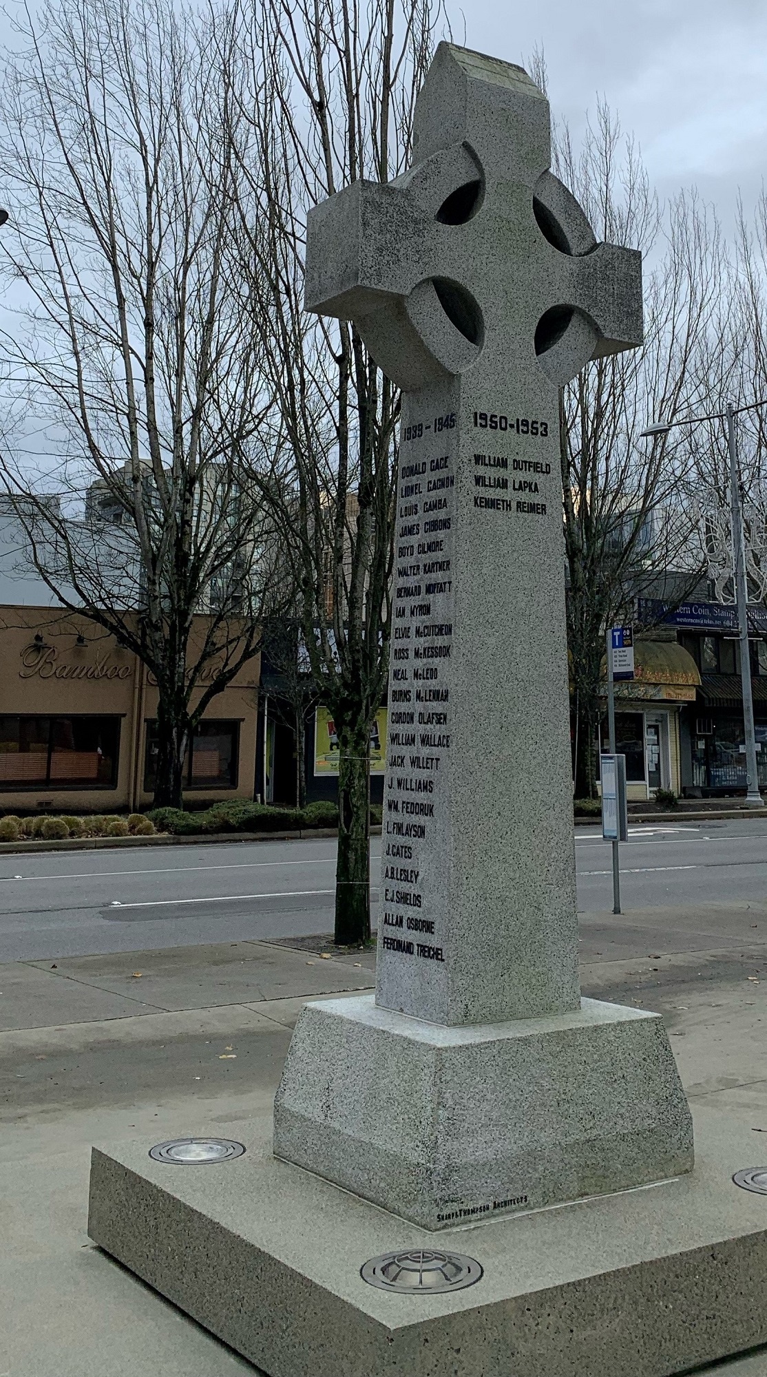 Reverend A. MacKay, the chairman of the Memorial Committee, appeared before Council on February 20, 1922, to state that the memorial would cost $1,612. This included the column with appropriate lettering, cement base and granite boulders. The Council granted the committee the sum of $300.00, and the remaining $1,312 was financed by public subscription and general fund-raising. A Celtic Cross was purchased from the Independent Monument Company, designed by Sharp and Thompson Architects, Vancouver, British Columbia. The cement base was finished by March 15, 1922, the column erected and four granite boulders were lettered for key battles of the Great War. The base of the monument is granite and it sits upon a concrete platform, two steps above grade.