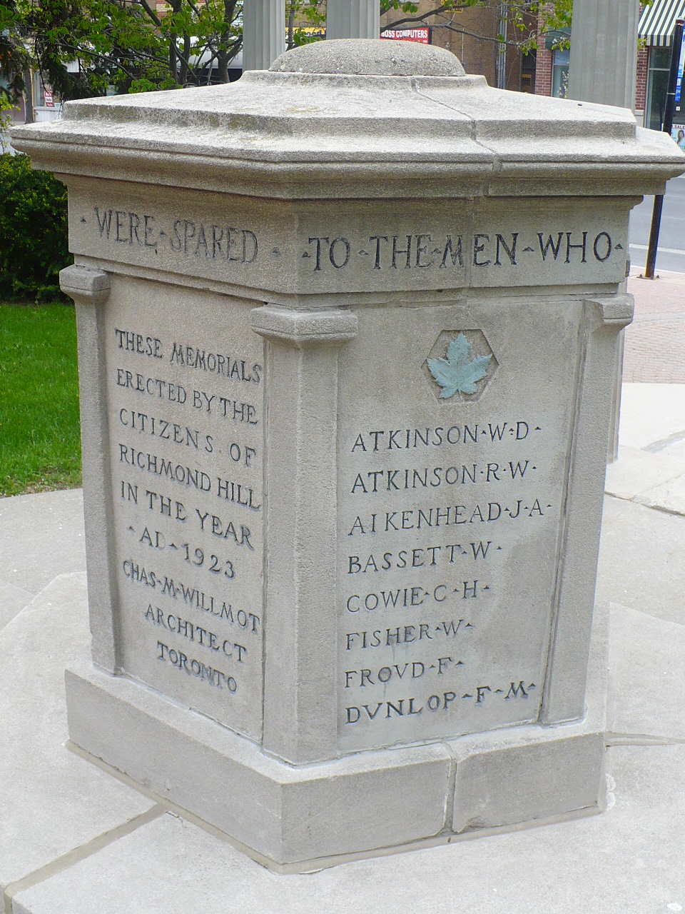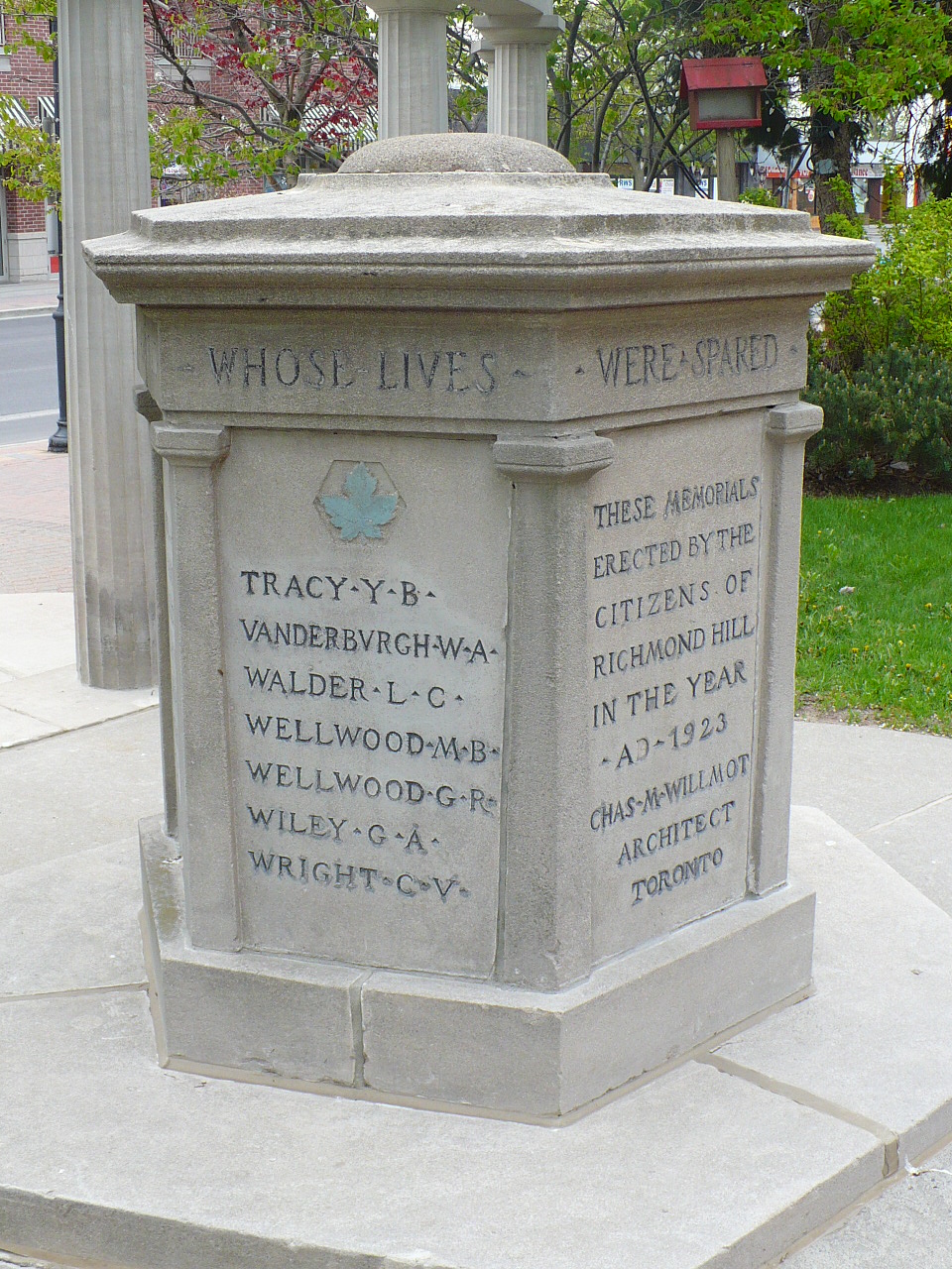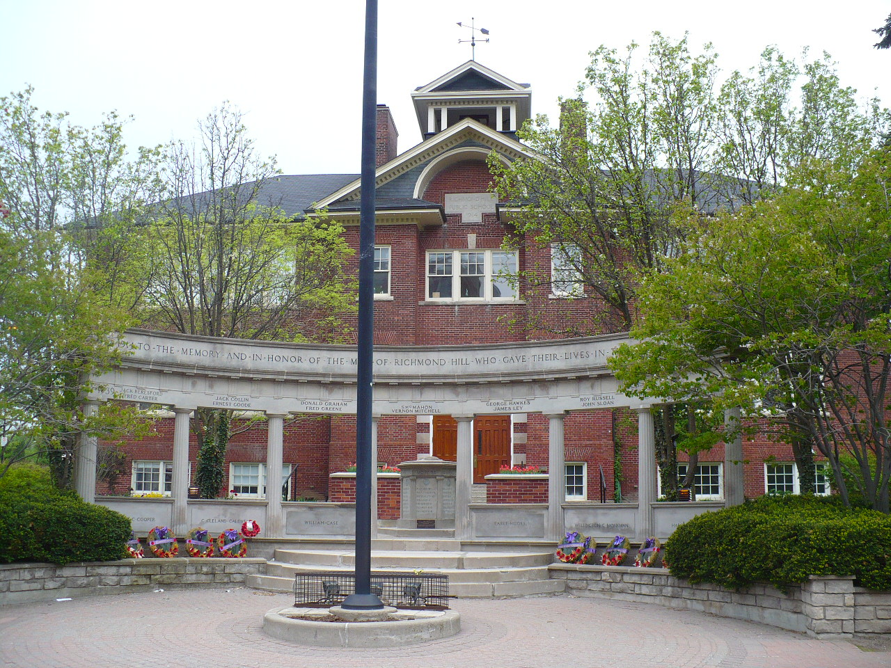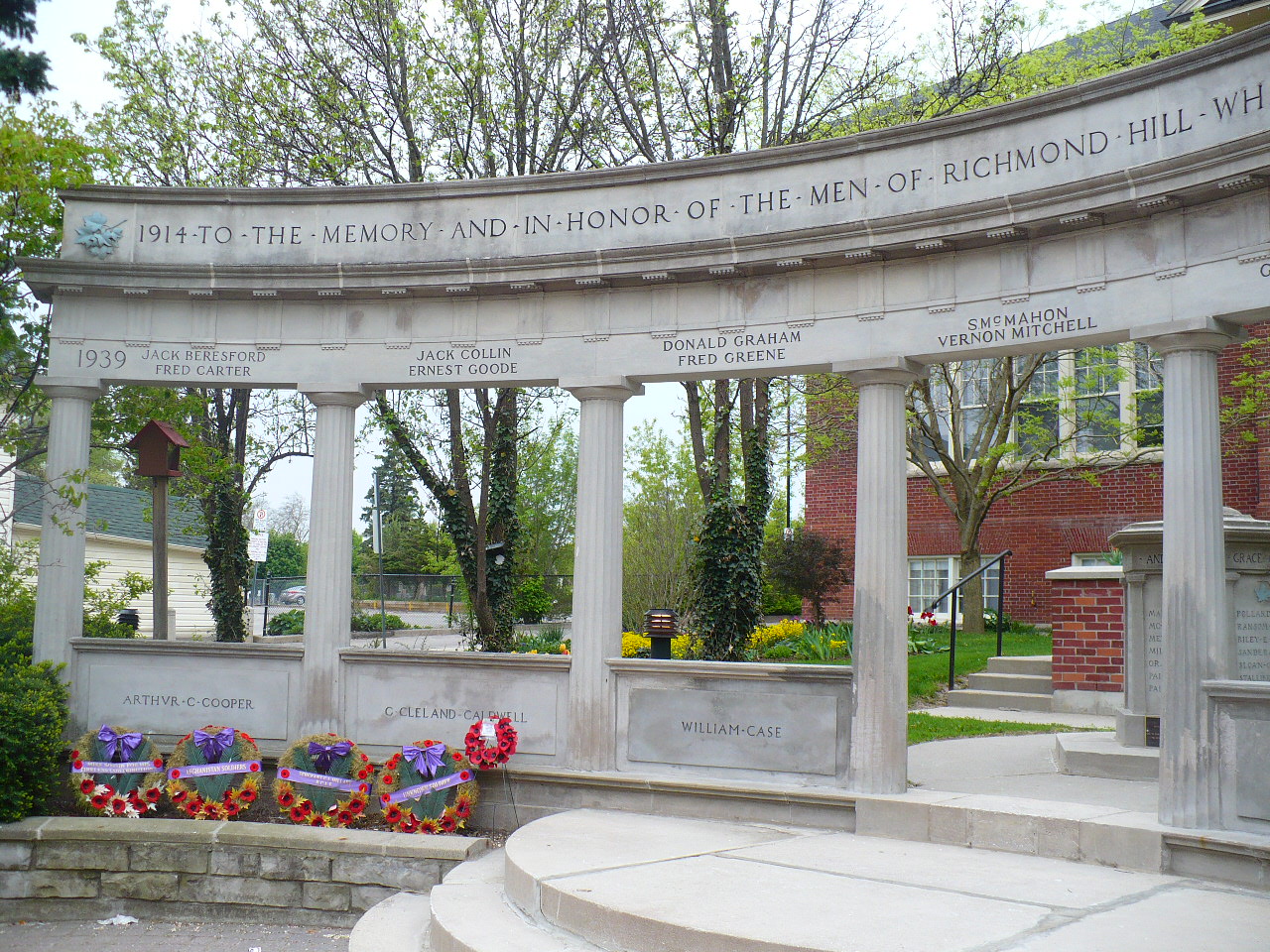 Erected in 1923, the Cenotaph was originally built to honour those Richmond Hill men lost in the Great War. Located in front of the old Richmond Hill Public School at 10100 Yonge Street (now the McConaghy Centre), the Cenotaph is on Richmond Hill’s Inventory of Buildings of Architectural and Historical Importance for its architectural, contextual and historical significance.
