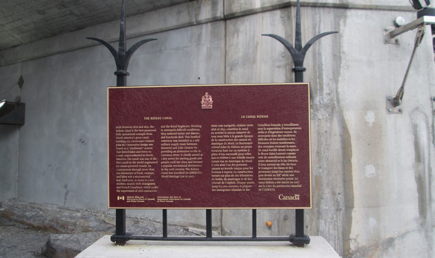 This metal plaque commemorates the construction of the Rideau Canal under the supervision of the Royal Engineers. The construction of the 200 km-long Rideau Canal (1826 – 1832) was a preventive military measure undertaken after a report that during the War of 1812 the United States had intended to invade Upper Canada via the St. Lawrence River.