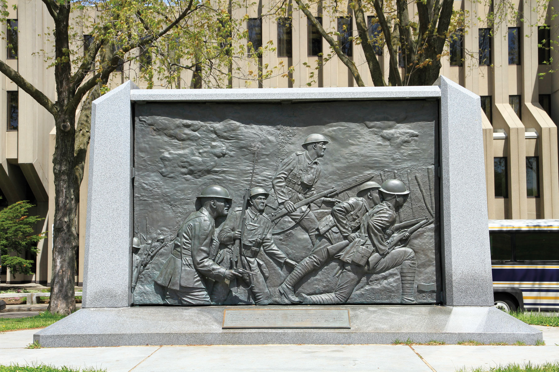 This memorial, erected by the Royal 22e Régiment and unveiled on 11 November 1989, honours the memory of the soldiers from the regiment who were killed during the First and Second World Wars and the Korean War. The low relief in bronze was sculpted by André D. Gauthier, who took his inspiration from A.T.C. Bastiens’s painting entitled “L’Avance”, displayed in the Canadian War Museum. The names of all those soldiers are inscribed on the grey granite walls on both sides of the monument.