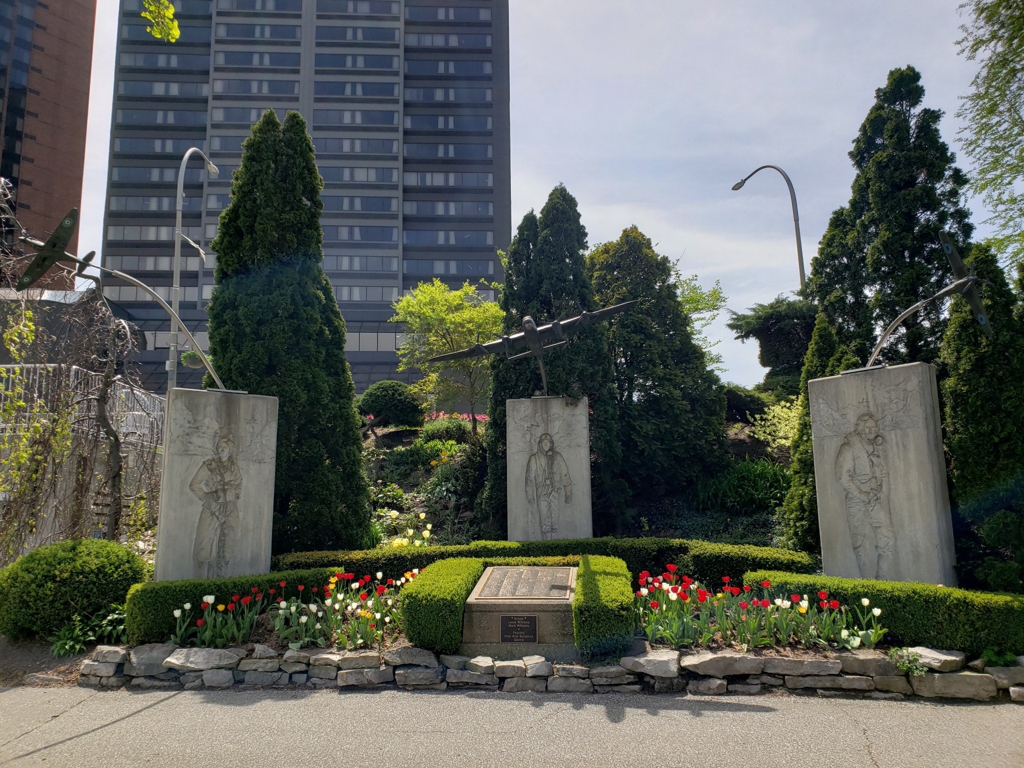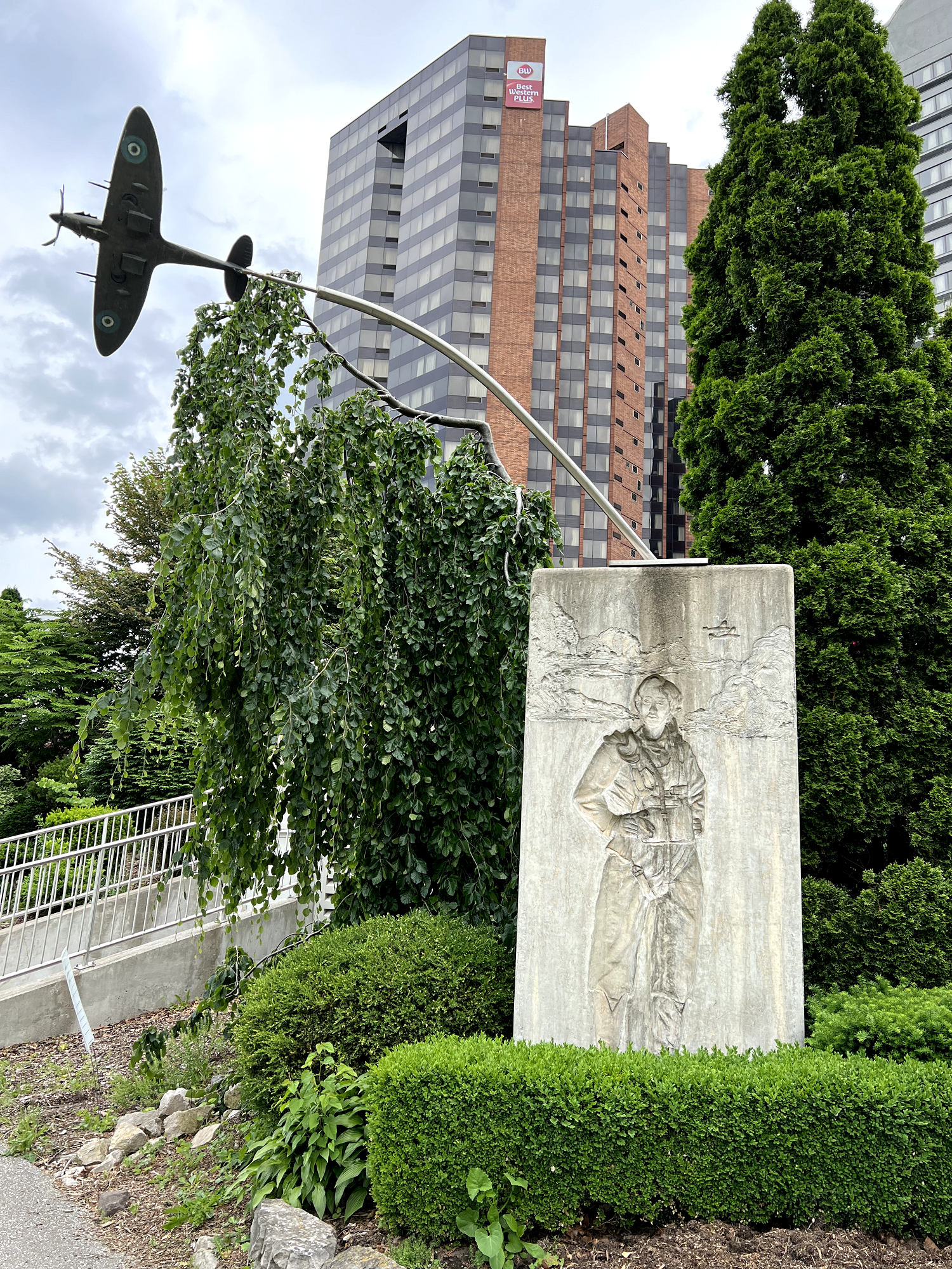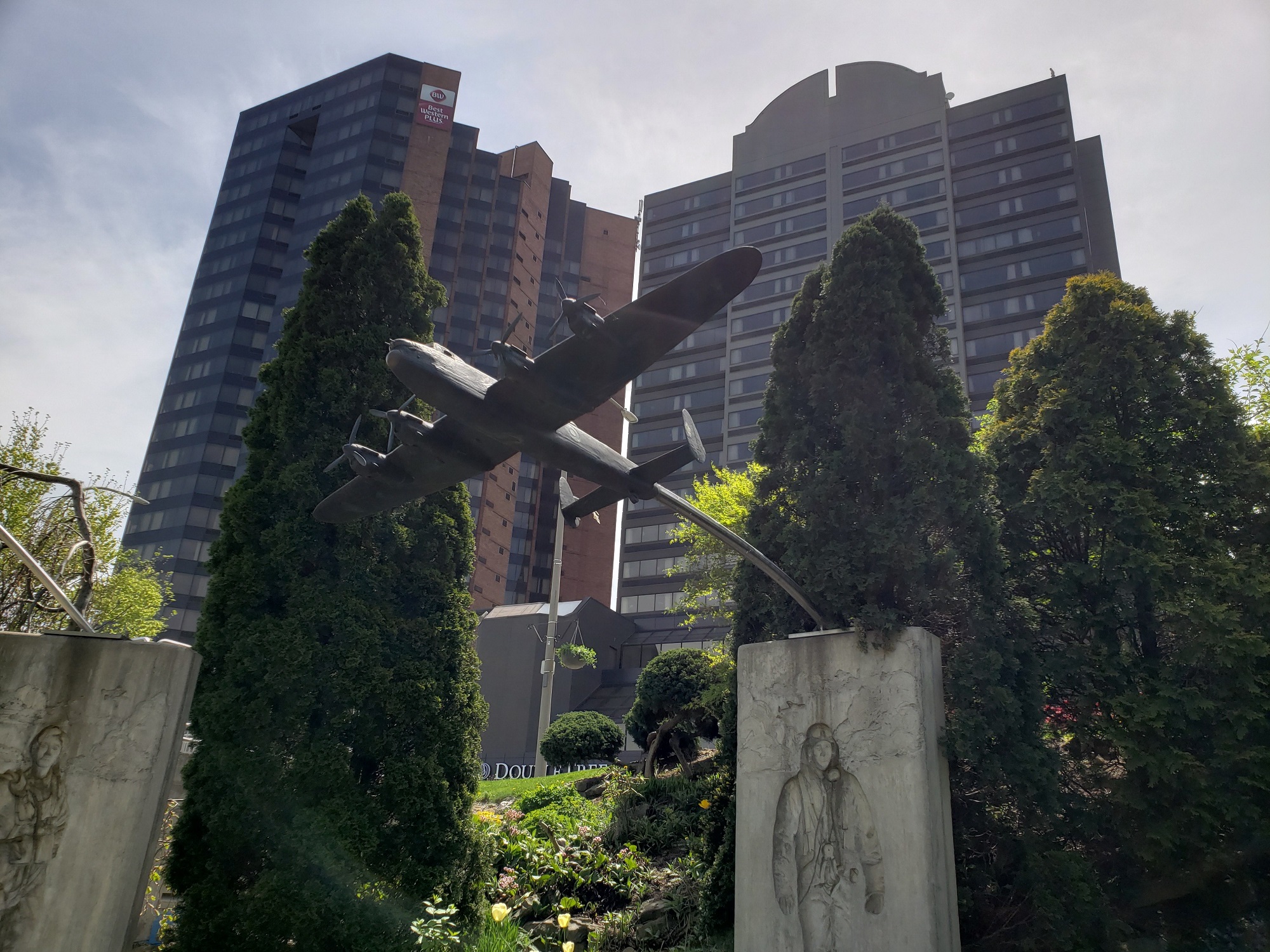 Major aircrafts from the Second World War - Lancaster, Spitfire and Hurricane were all hand sculpted, then molded and poured in bronze. The planes were mounted onto stainless steel poles installed by the City. They extend outward over the top of the concrete walls, offering the illusion of planes in flight.