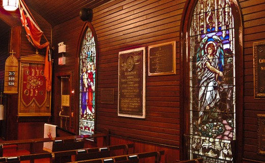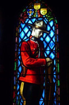 On each side of the altar is a stained glass memorial window, each portrays a member of the force. On the left is a constable in mourning; on the right is a trumpeter sounding reveille. The model for the windows was Constable John Roy Fraser of Westville, Nova Scotia, in 1943. Fraser retired in 1960 at the rank of staff sergeant. The Memorial Project came about following the shooting of Constable Willis Edward Rhodeniser on the White Bear Reserve near Carlyle, Saskatchewan, on August 26, 1939. Two more stained glass memorial windows on each side wall near the front were dedicated on November 4, 1951. The Resurrection in the west window honours serving members and The Nativity in the east window honours ex-members of the force who died in the Second World War.