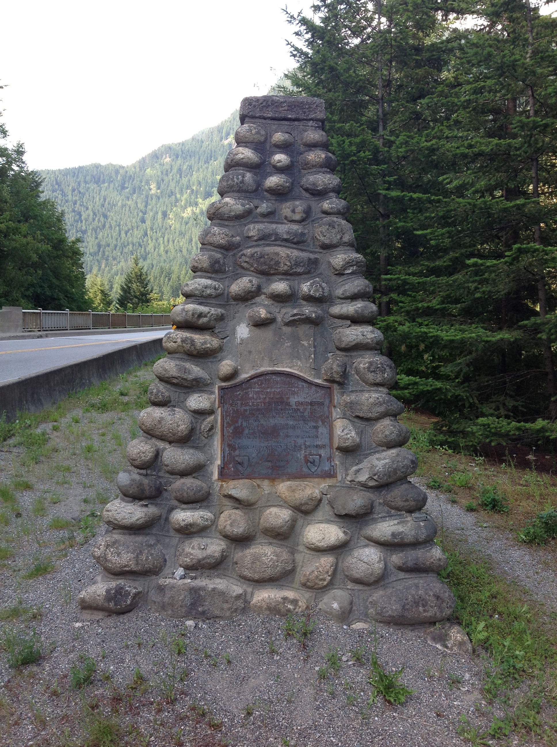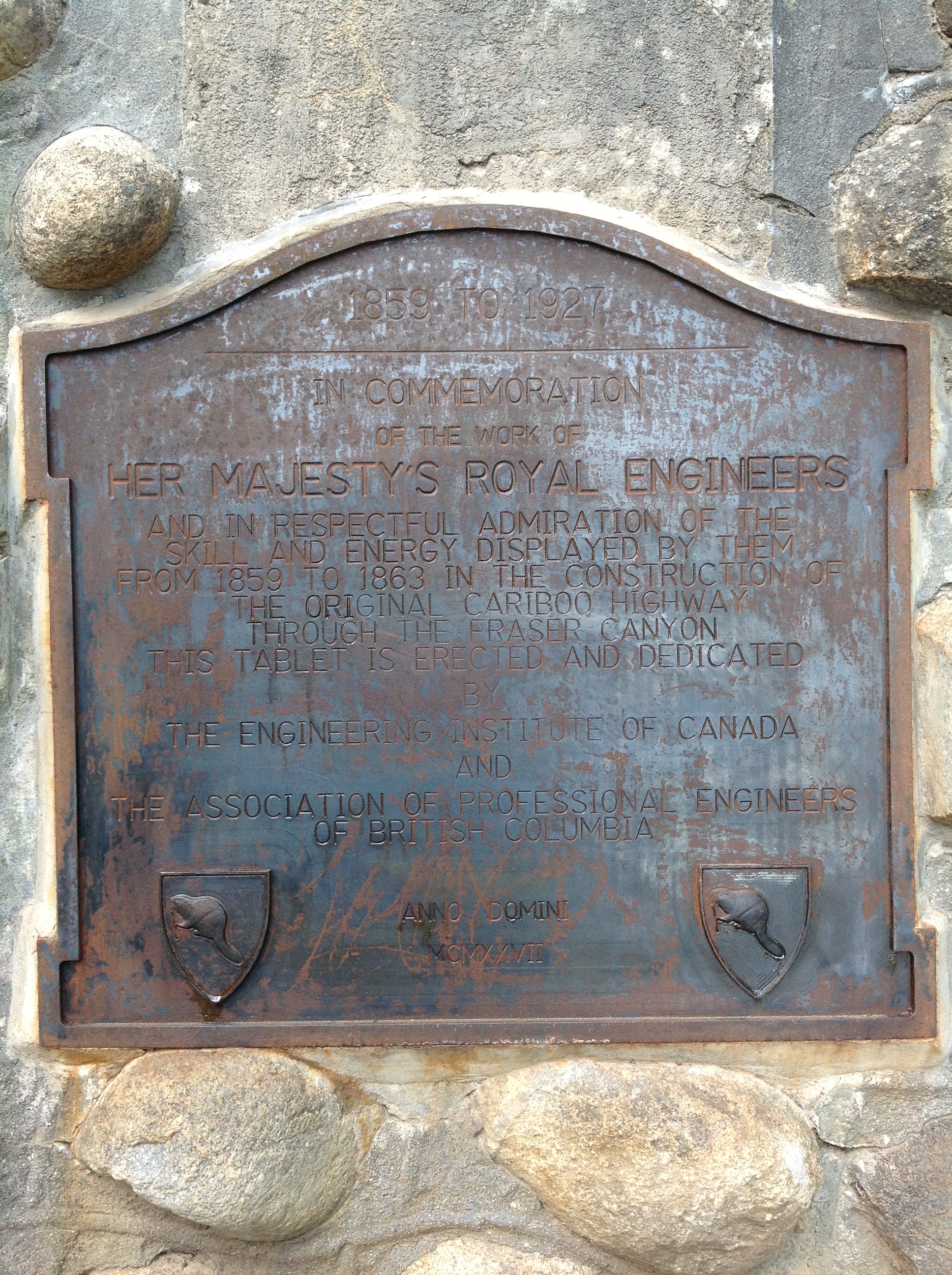 The Royal Engineers Memorial was erected in 1926 by the Engineering Institute of Canada and the Association of Professional Engineers of BC in honour of the Royal Engineers who built the original Cariboo Highway. The original plaque was stolen, and the Ministry of Transportation fabricated and installed a replacement plaque.