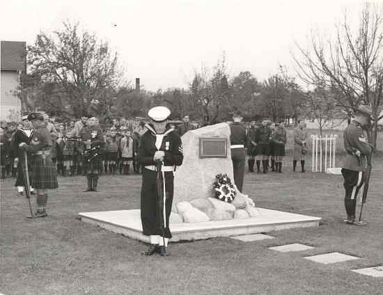 Constructed in July of 1919, the monument has become a memorial to the war dead of 1914-1918, 1939-1945, 1950-1953 (Korea) and to Major Ernest W. MacQuarrio, CD, MA, BD Ceremonial Chaplain 1972-1993. It consists of a large block of granite approximately 1.7m high, set on a concrete base and dias of rough cast finish.