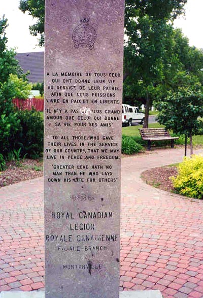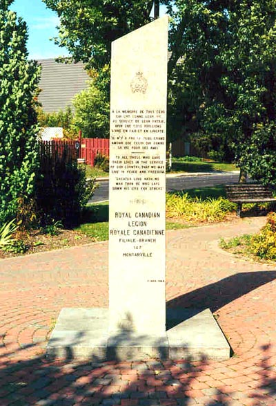 Erected by Royal Canadian Legion Branch No. 147 in November 1989, this memorial is dedicated to all Canadian war dead. An image of the Royal Canadian Legion crest is depicted above the description.