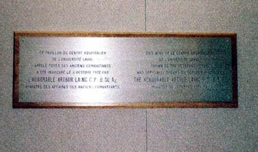This memorial is dedicated to all veterans. It was erected when the building was constructed and officially opened on October 3, 1972 by The Honourable Arthur Laing, C.P., B.Sc.Ag., Minister of Veterans Affairs. The memorial was erected by the "Centre Hospitalier Universitaire de l'Université Laval" and the Ministry of Veterans Affairs.