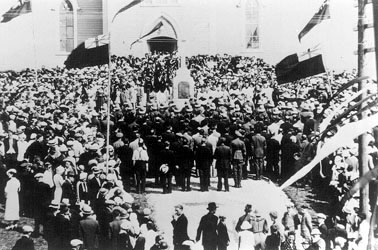 [On remarquera qu'une plaque a été rajoutée en bas de la plaque originale pour y ajouter le nom d'Émile Comeau. En 1996, les paroisses de Clare voulaient connaître leurs combattants tués aux guerres. À la suite de cette demande, Gérard Thériault, légionnaire, a découvert qu'il y a eu deux Émile Comeau de la région qui avaient sacrifié leur vie dans les guerres mondiales (l'un pendant la première guerre, l'autre pendant la deuxième) et que le nom du deuxième ne paraissait pas sur la plaque. Ainsi, en 1997, on a ajouté le nom de Émile Comeau au bas de la plaque lors d'une cérémonie spéciale de reconnaissance. La photo ci-dessous montre Madame Nora Blanchette, la soeur d'Emile Comeau, posée devant le monument à l'occasion de cette cérémonie. (Pour plus d'information, voir Le Courrier de la Nouvelle-Ecosse du vendredi 29 août 1997)./Note that a plaque was added on the bottom of the original plaque in order to add the name of Émile Comeau. In 1996, the parishes of Clare wanted to know the names of the soldiers of their region who had been killed in the wars. Given this request, a legionnaire, Gérard Thériault, discovered that two men from the region named Émile Comeau had sacrificed their lives in the world wars (one during the first war, and the other during the second) and that the name of the second did not appear on the plaque. It was thus that, in 1997, on the occasion of a special remembrance ceremony, the name of Émile Comeau was inscribed on another plaque added at the bottom of the monument.