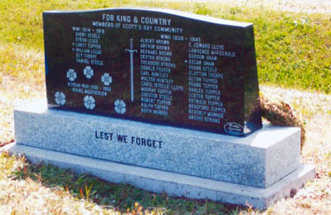 The community of Scott's Bay, Kings County, Nova Scotia, has always sent its men to war, with losses sustained in both World Wars. In the small community, every 'lost' or 'wounded' touched every home... of course, some more than others due to kinship. Carey Judson Tupper (38 years) and William H. Legge (31 years) died in the First World War. Oscar W. Shaw (22 years) was lost in the Second World War. In 1977, Carey Tupper's son, Wellesley, retired to the area. With Stanley Huntley of Scott's Bay and Lawrence Bennett of Kentville, the three men undertook to build a modest war 'memorial' to place in front of the Union Church cemetery. A wrought-iron fence, looking much like a grave enclosure, was designed and built, the iron-work done by Mr. Bennett. Three simple, white wooden crosses were born under the skilled hands of Mr. Huntley. Name-plates for the crosses were contracted and installed. In its life, it served as a reminder to all who passed that the community had paid dearly in the name of freedom. On annual Remembrance Days, services were held by the community through the Royal Canadian Legion: wreaths and flags placed at the modest memorial, as were placed elsewhere in Canada. Eventually, changing seasons and continual salt-laden on-shore winds took their toll. The enamel blistered and the iron rusted, the name-plates became discoloured and the painted crosses lost their clean, white image. The name-plates were replaced at least once and the iron received scaling and repainting several times, along with fresh paint to the crosses. In the spring of 2002, Carey Tupper's grandson, Clayton, of Fredericton, New Brunswick, replaced the wooden crosses but noted the ironwork had further deteriorated. Feeling that perhaps it was a fitting time to think of a replacement, possibly a permanent memorial, Clayton contacted Gwen Huntley, Chairperson of the Scott's Bay Union Church Cemetery Committee... offering to assist should the community agree with the proposal. As a result, on August 4th, 2002, a permanent memorial on the same site was unveiled and dedicated... Black granite memorial stone on a grey base. A large turnout enjoyed sunshine and breezes at the ceremony, presided over by Gwen Huntley. Dignitaries present were the County Warden (Fred Whalen), County Councillor (Bert Greene) and MLA, Mark Parent, who addressed the gathering as member of the Standing Committee on Veteran's Affairs for Nova Scotia. A veteran's widow, Irene Huntley, read the names on the memorial... those who died and those who served and survived. Surviving Second World War veterans, Theordore and Dexter Dykens, respectively unveiled the memorial and placed a wreath. Clayton Tupper spoke of his love of the community, a touchstone in his life although he had not lived in Scott's Bay since a small child. Gwen Huntley spoke for herself, and all in attendance to remember why the wars were fought... closing with "We seek and pray for justice for both women and men, young and old, for the poor, ill and lonely. Remember to hope, care and share." God Save the Queen was sung, and the Church's clergy led the gathering in prayer.