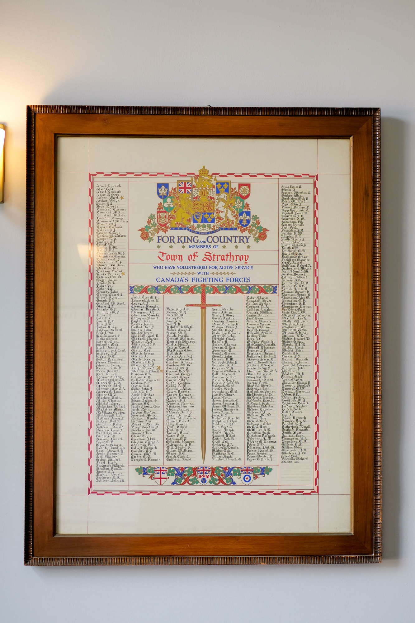 It is not known when the Second World War Honour Roll was created or installed at City Hall. This style of an Honour Roll was designed by A.J. Casson when he worked at Sampson-Matthews, a prominent midtown Toronto lithography and commercial art company.