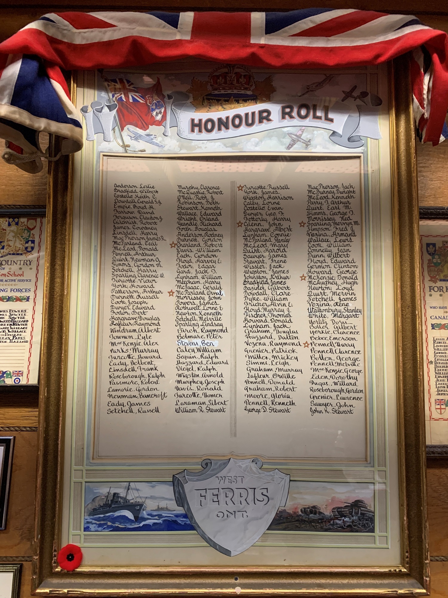 The Honour Roll was hanging in the township office until West Ferris was amalgamated into North Bay. Luckily, the township entrusted the Honour Roll to Tod Russel's father and it made its way into the Royal Canadian Legion Branch 599 West Ferris.