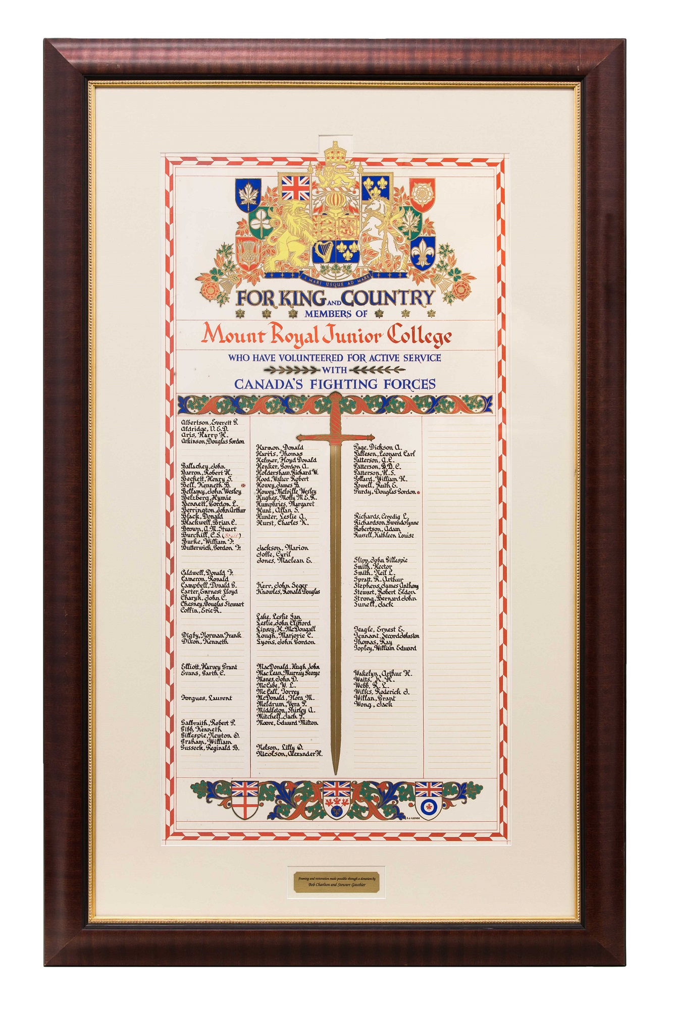 This Honour Roll commemorates Mount Royal Junior College students, faculty, and staff who served in the Second World War. It was displayed in a prominent place in the old Mount Royal College campus in downtown Calgary before it was moved to Mount Royal University Library's Archives and Special Collections. This style of an Honour Roll was designed by A.J. Casson when he worked at Sampson-Matthews, a prominent midtown Toronto lithography and commercial art company.