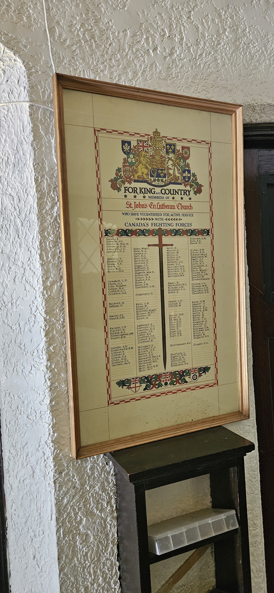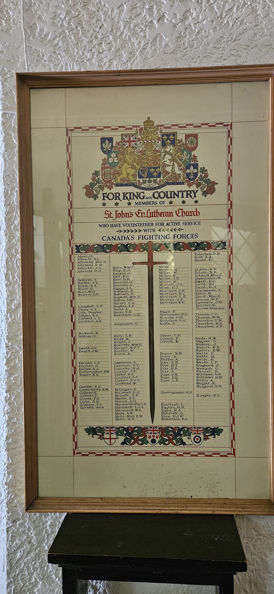 It is not known when the Second World War Honour Roll was erected in St. John's Evangelical Lutheran Church. This style of an Honour Roll was designed by A.J. Casson when he worked at Sampson-Matthews, a prominent midtown Toronto lithography and commercial art company.