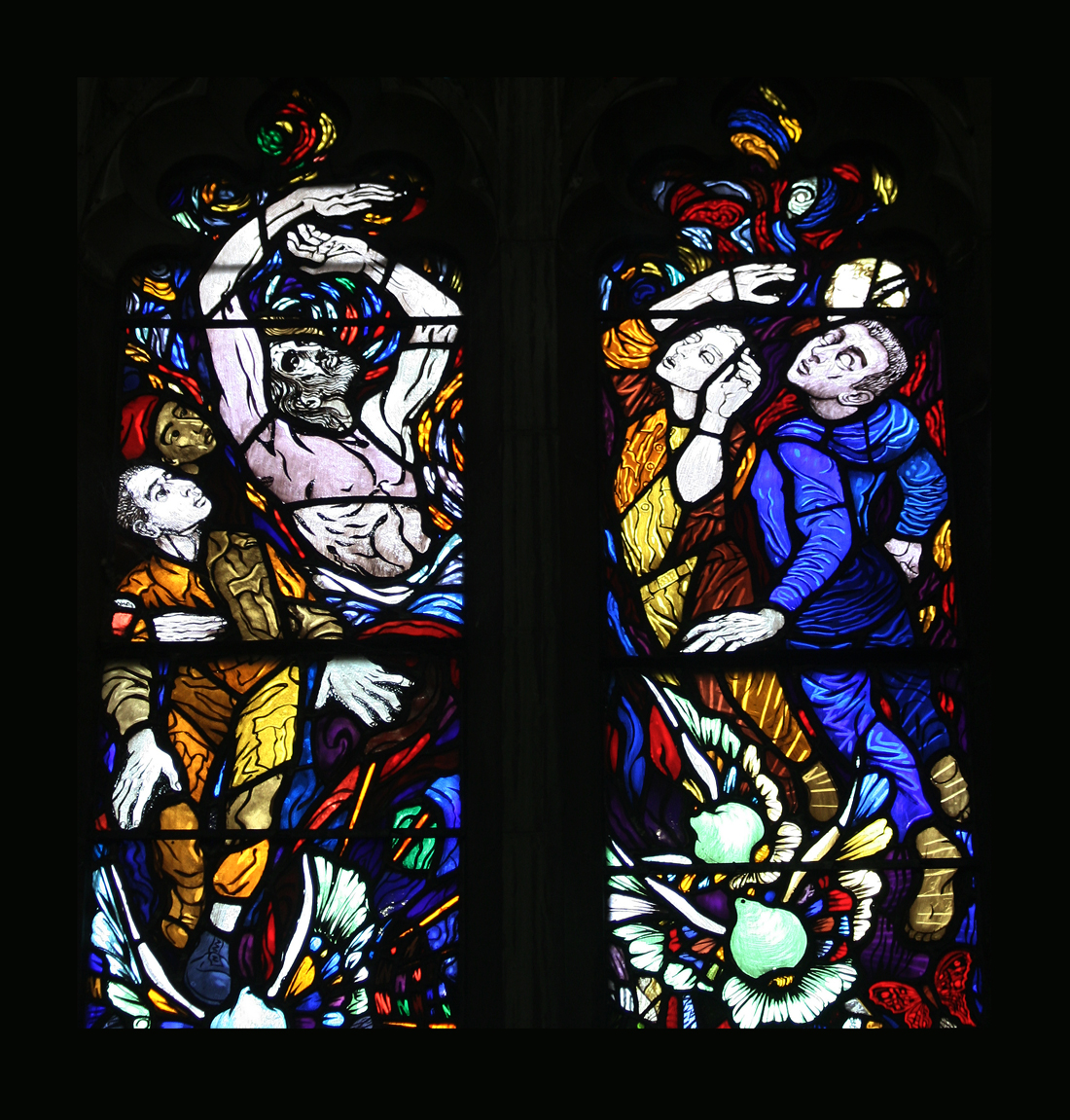 Your vantage as you look through this window is presumed to be in a church where the windows have been destroyed. In the five lower section on each side you will observe fragments of glass which come to a point in a Gothic frame. Through the left panel you observe Chichester Cathedral in southern England near which the Canadian Army was stationed between 1939 and 1945. Through the right window there is the outline of the Martinikirk in Groningan Holland where I conducted a Thanksgiving Service for 5th Canadian Armoured Division the Sunday following VE Day. The top two sections of these windows have figure wearing uniforms and surmounting them is the figure of Christ. In the mullion at the top there is a beautiful swirl of glass with a modernistic touch and this centres on a circle representing the source of light.
