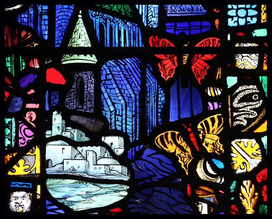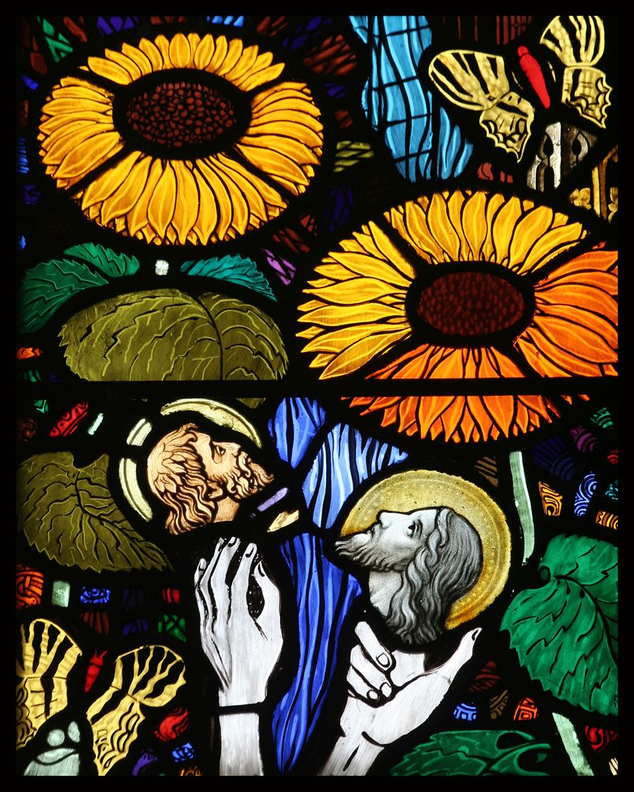 The WWII Memorial Window includes Fragments collected by DR. R.F. Sneyd from churches damaged during the 2nd World War. Ernst Taylor, the artist 1950, has placed most of the historic fragments around the edges of the window to be a realistic part of the pictures in these windows. He has pained six large and bright sunflowers here to give brightness and color and depth, but also to suggest that they are looking up toward the light. The butterflies suggest the matter of air and flight created by these insects. The seven doves suggest the motion of flight and, of course, symbolize peace. The uniformed figures represent “the flight to Glory” of those who have died sacrificially.