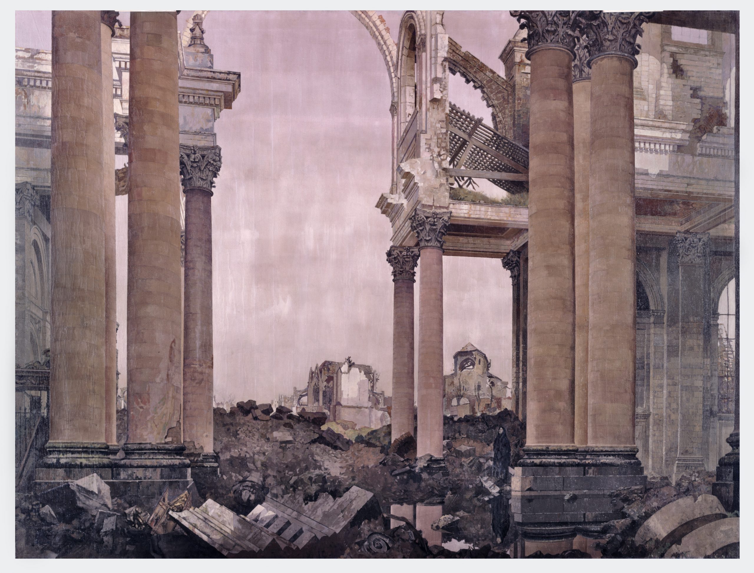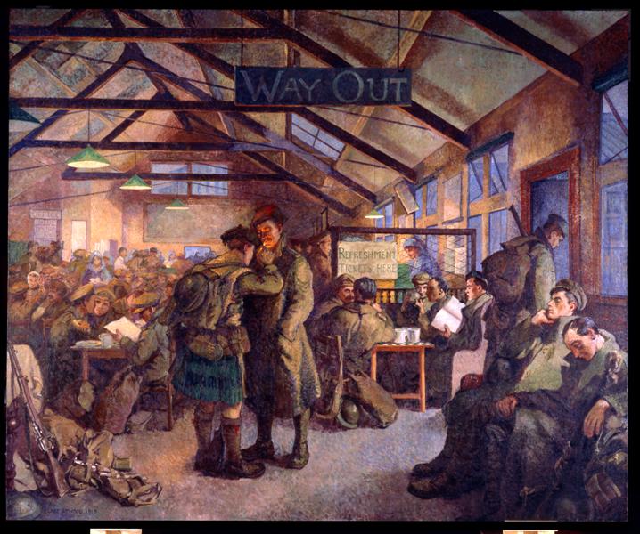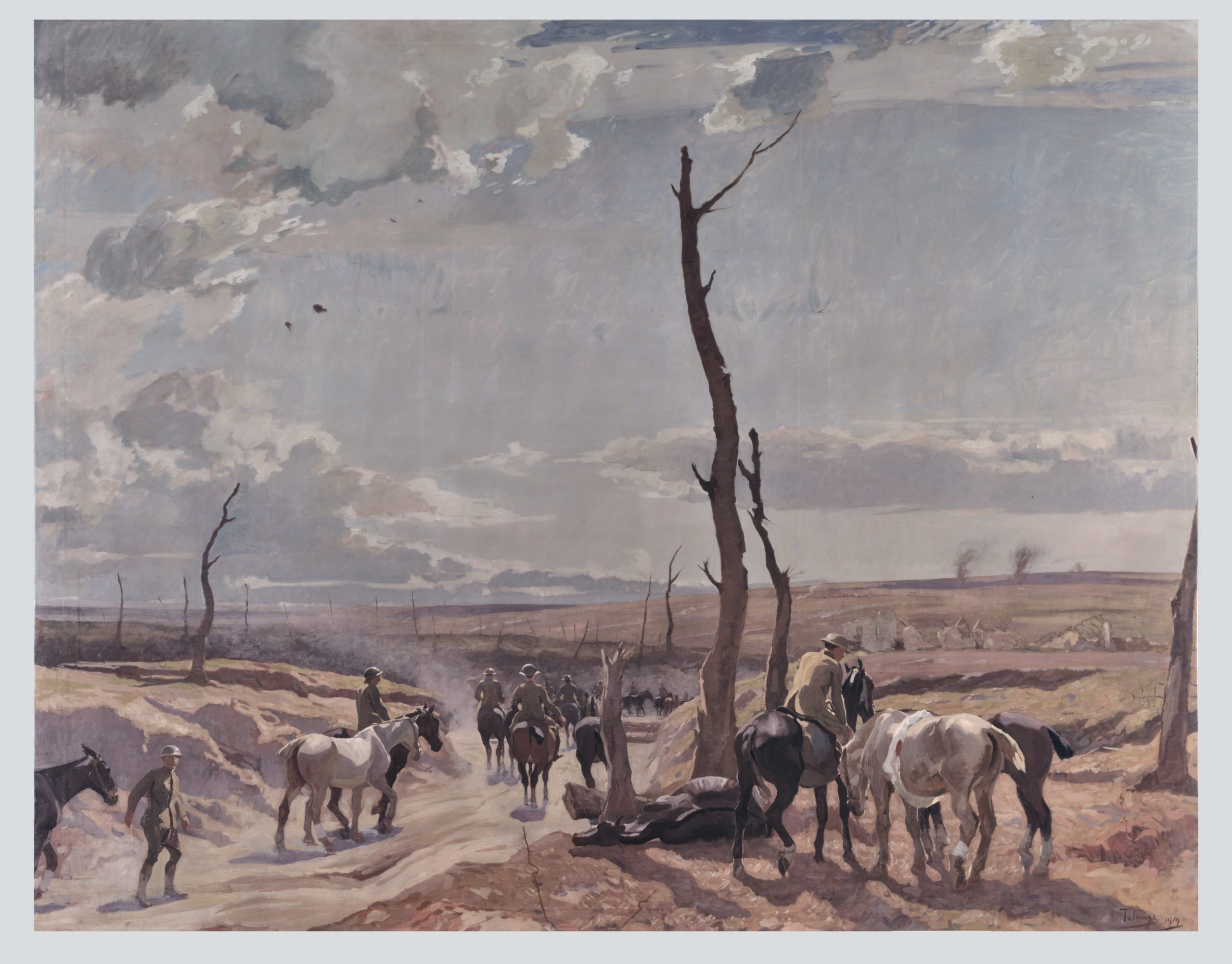The eight paintings are; The Watch on the Rhine (The Last Phase) by Sir William Rothenstein; A Mobile Veterinary Unit in France by Algernon Talmage; Arras. the Dead City by James Kerr-Lawson; On Leave by Clare Atwood; Canadian Railway Construction by Leonard Richmond; Returning to the Reconquered Land by Sir George Clausen; Landing of the First Canadian Division at SaintNazaire, 1915, by Edgar Bundy; and The Cloth Hall, Ypres by James Kerr-Lawson.