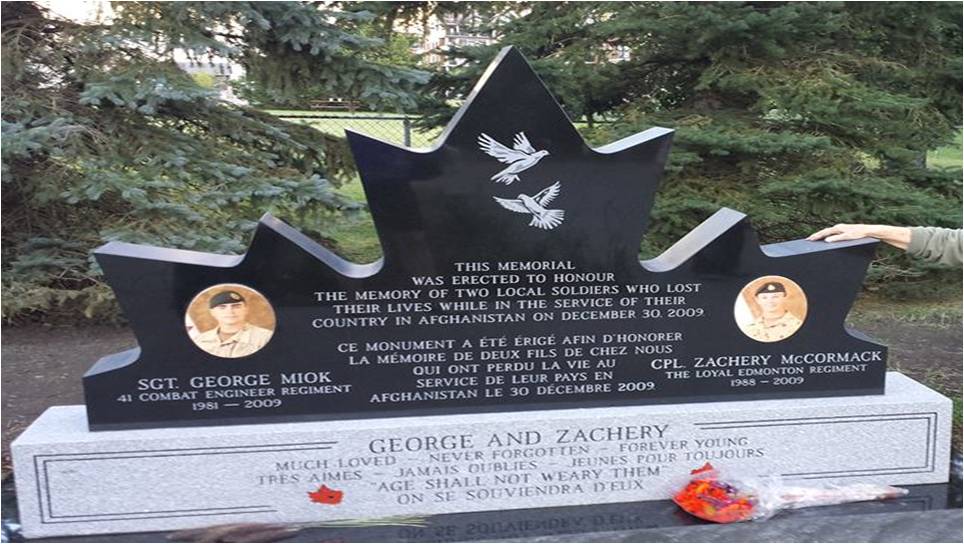 On December 30, 2009, Sergeant George Miok and Corporal Zachery McCormack, two young men from Sherwood Park, lost their lives while serving in Kandahar, Afghanistan. As members of the Kandahar Provincial Reconstruction Team, they were conducting a patrol in an area four kilometers south of Kandahar City when their armoured vehicle was hit by an improvised explosive device. Sergeant Miok and Corporal McCormack, along with two other Canadian soldiers and a Canadian journalist, were killed in this attack.