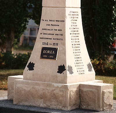Erected in October 1923 by the Town of Shellbrook, and the Royal Canadian Legion, this memorial was originally dedicated to all Canadian war dead, in particular those from Shellbrook and area. The property for the Memorial was on the east corner of Main Street and 2nd Ave. East in Shellbrook and was owned by the Canadian National Railway. The property had a slough hole to a depth of six feet, this required filling. Shellbrook Municipality donated one hundred and fifty dollars to purchase the lot. The Town of Shellbrook owned the adjacent lot and donated and three hundred dollars to the Legion. Subscriptions were received from the public as well. The memorial was erected in October 1923 on a six foot concrete base that rested on the original ground, then dirt fill was hauled in to level the property. Construction took place soon after in an impressive ceremony with all the Local Church Clergy, the militia, school children and the public. The memorial was later expanded to commemorate the losses of the Second World War and the Korean War. The Legion Memorial Cenotaph was turned over to the Town of Shellbrook as a permanent Memorial to those who lost their lives in the First and Second World Wars.