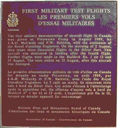 The Silver Dart, a monument in CFB Petawawa, is in memory of the first military demonstration of powered aircraft flight in Canada that was given at Camp Petawawa on 2 August 1909 by J.A.D. McCurdy and F.W. Baldwin in the Silver Dart. Both pilots, former members of the 2nd Field Company, Toronto and Engineers of No 8 Engineer Services and Works Company, acted as the ‘ground crew.’