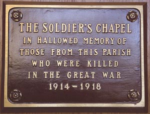 This Chapel was erected by the Parish of St. Luke and unveiled in 1919. This memorial was dedicated to the Parishioners killed in action during The Great War.