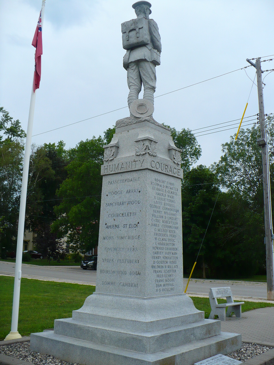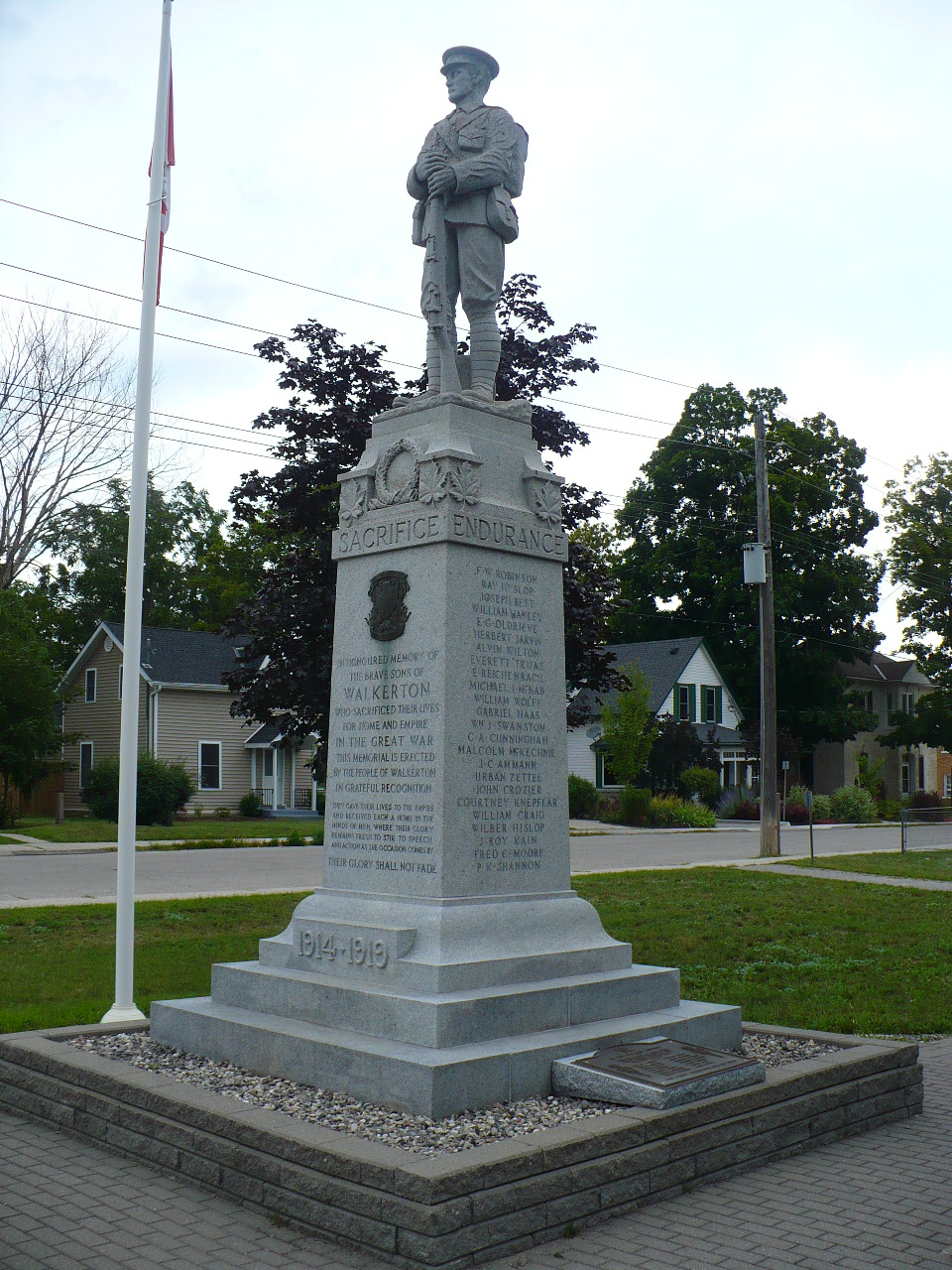 The Soldiers' Memorial is dedicated to the men of Walkerton area who gave their lives in the First and Second World Wars. Mrs. Oswald Lumley, the wife of First World War Veteran, Oswald Lumley, wrote the inscription and the McIntosh Granite Co. Ltd. of Toronto designed the memorial. It is of gray granite and has a three step granite base, with die and cap, on which is mounted a huge statue of a Canadian soldier standing at ease with rifle in hand. The monument is 17 feet high and lists the names of the 49 Walkerton heroes who fell in the war, with the names of the battles where they lost their lives. It was erected on the northwest corner of the Armoury grounds on a raised mound thirty feet square.