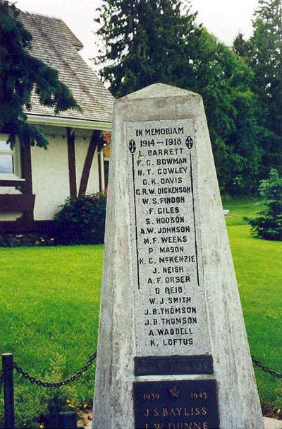 This cenotaph, a four-sided granite obelisk with beveled corners, was erected by the Royal Canadian Legion Branch #107 sometime after 1918. It is located in front of St. Mary’s Church, and is in memorial to the fallen of Sorrento.