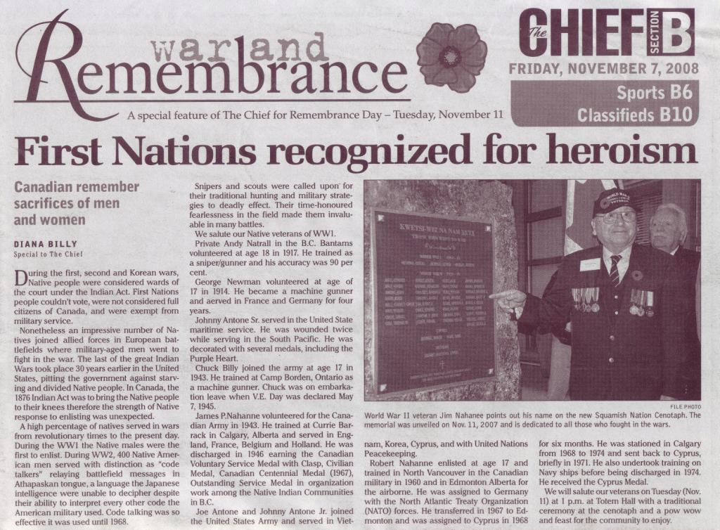 The Native Memorial in Squamish, British Columbia, is dedicated to all native servicemen who fought in all conflicts and wars. It was unveiled on November 11, 2007.
