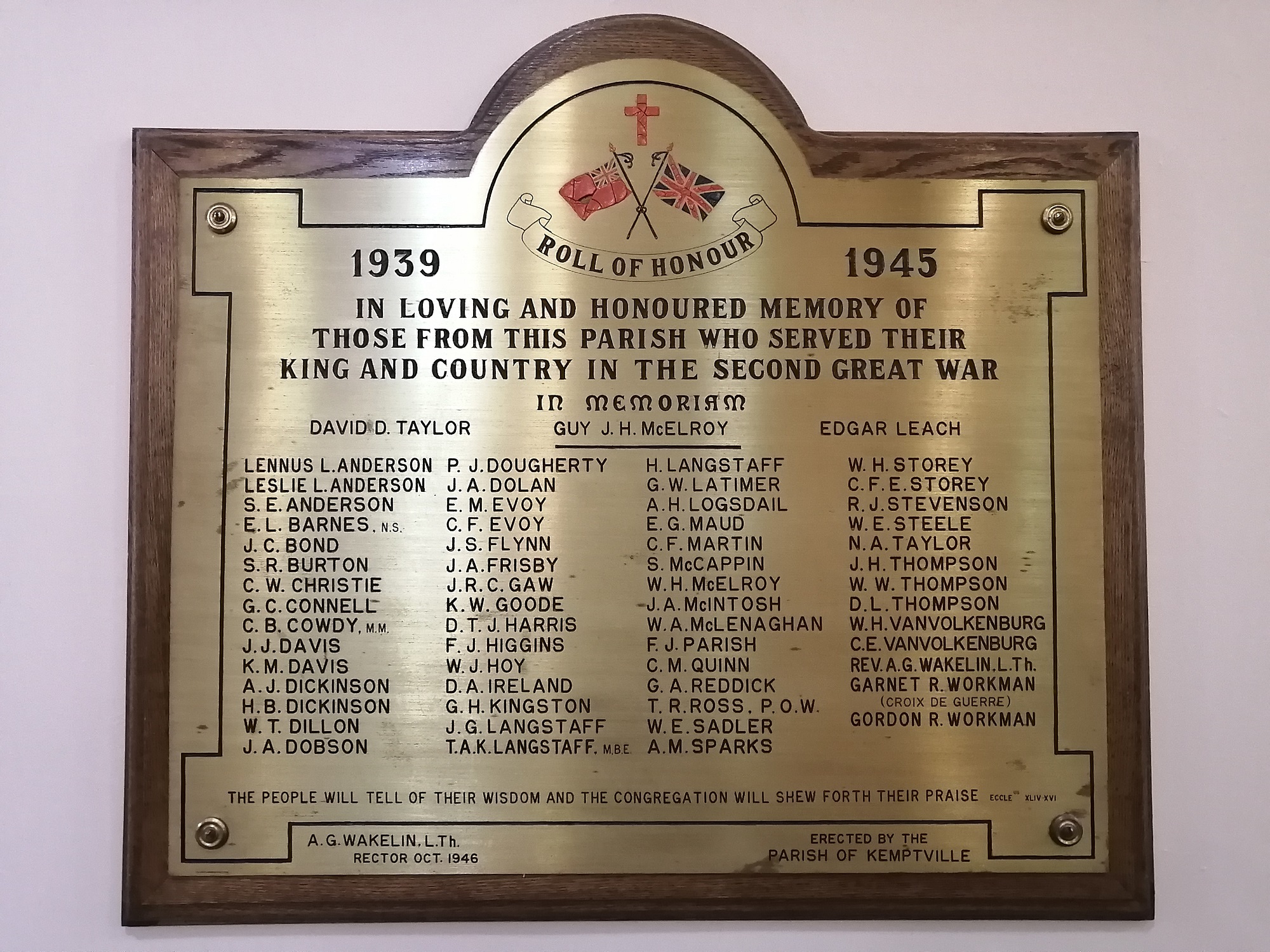 The St. James Anglican Church Second World War Roll of Honour was erected in October 1946 and dedicated to members of the congregation who served during the Second World War.