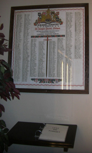 This framed scroll with a Memorial Book was erected by St. Joseph`s Parish. The scroll has the names of all members of St. Joseph`s parish who volunteered for active service with Canada`s fighting forces in the Second World War while the Memorial Book has short biographies of those members who gave their lives.