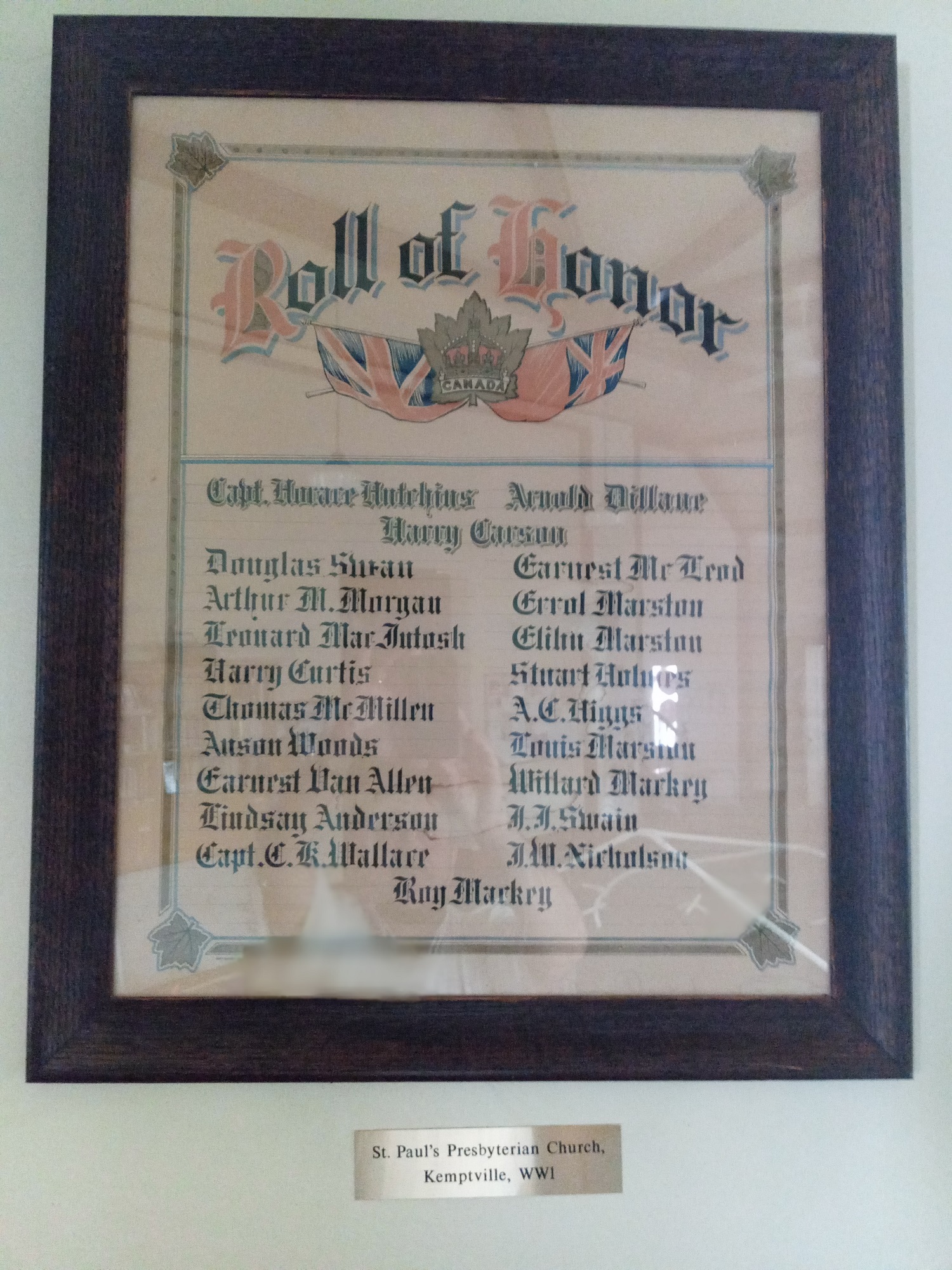 This Roll of Honor was dedicated in 1951 by the Congregation of St. Paul's Presbyterian Church in memory of those members and adherents who served in the First World War.