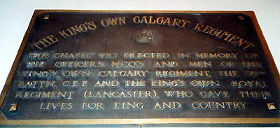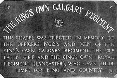 The association of the King's Own Calgary Regiment and St. Stephen's Church, Calgary, has covered many years. During this time the Regiment has been served and assisted by the Ministers who occupied the pulpit and all of whom in their turn were Chaplain of the Regiment. Hundreds of past and present members of the Regiment regard St. Stephen's as their 'home' church. The affiliation of the Regiment with the church was warmly welcomed by the congregation who took pride in the association and when it became necessary for St. Stephen's to erect a new church building, they showed their respect and affection by incorporating into their building plans a Memorial Chapel dedicated to the Calgary Regiment. This was a free gesture on the part of the congregation and is an honour granted to few regiments in Canada.