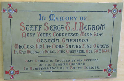 This memorial plaque erected by officers of the Ottawa Brigade is dedicated to the memory of Staff Sergeant T.J. Benbow, Cameron Highlanders, who lost his life while saving five others in the Webster Hotel fire in Montreal on October 30, 1899.