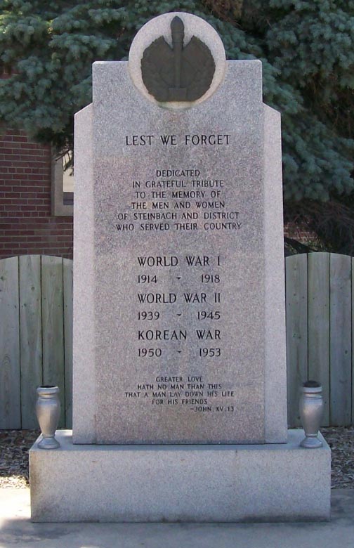 At a regular meeting of the Steinbach Royal Canadian Legion Branch 190 that it was decided to erect a cenotaph at a cost of $1,155.00 plus the cost of the base. It was erected to the memory of the men and women of Steinbach and district who served their country and unveiled 16 September 1955.