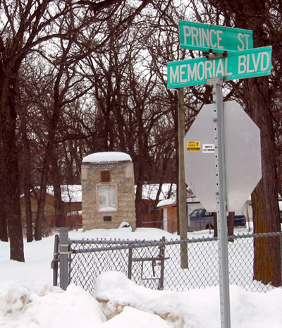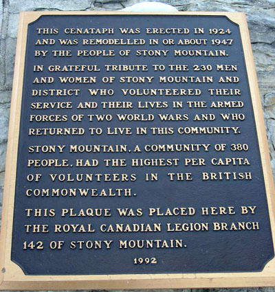 This memorial was dedicated to the men who gave their lives in the First and Second World Wars and the Korean Conflict. It was erected by the Stony Mountain residents.