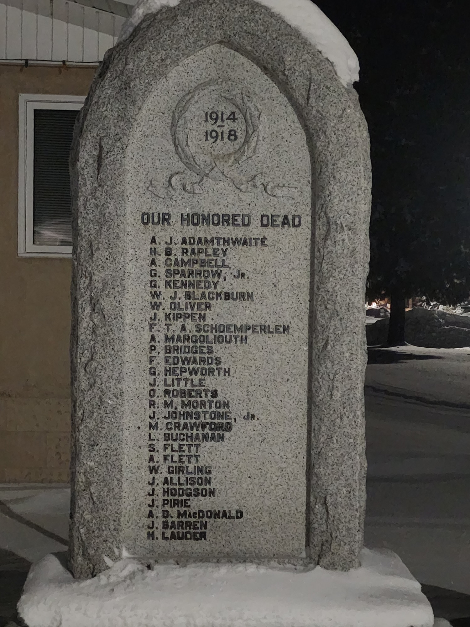 The Strathclair Cenotaph was dedicated in the summer of 1925 in memory of the local war dead of the First World War. It was erected by the Soldiers' Association of Strathclair and financially assisted by the Rural Municipality of Strathclair. The cenotaph has a pointed Gothic top, roughened outline and carvings of a wreath with ribbon.