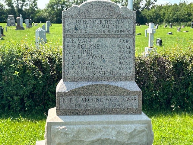 Erected by the community of Summerberry, this memorial is dedicated to the local war dead of the Second World War. In September 2021, it was moved from the school in town to its current location in the cemetery. Remco installers in the area saw that the local Legion was trying to raise funds to have it moved and they volunteered their time and moved it at no charge. The cemetery provided the foundation for the memorial.