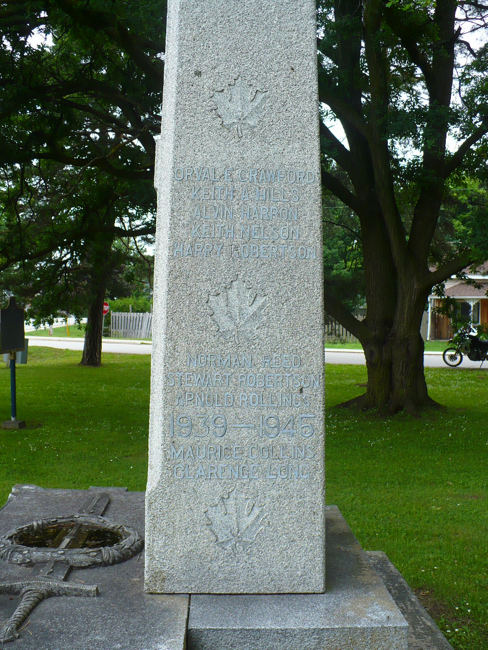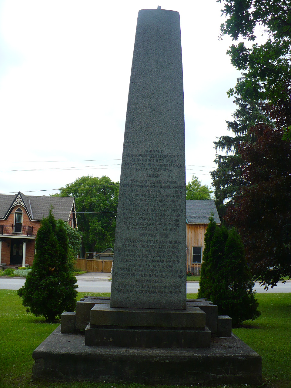 The Tara Cenotaph was originally erected to honour those lost in the First World War, the names of those lost in the Second World War were added later. The memorial lists names from the village of Tara and the Township of Arran, along with the dates of their death.