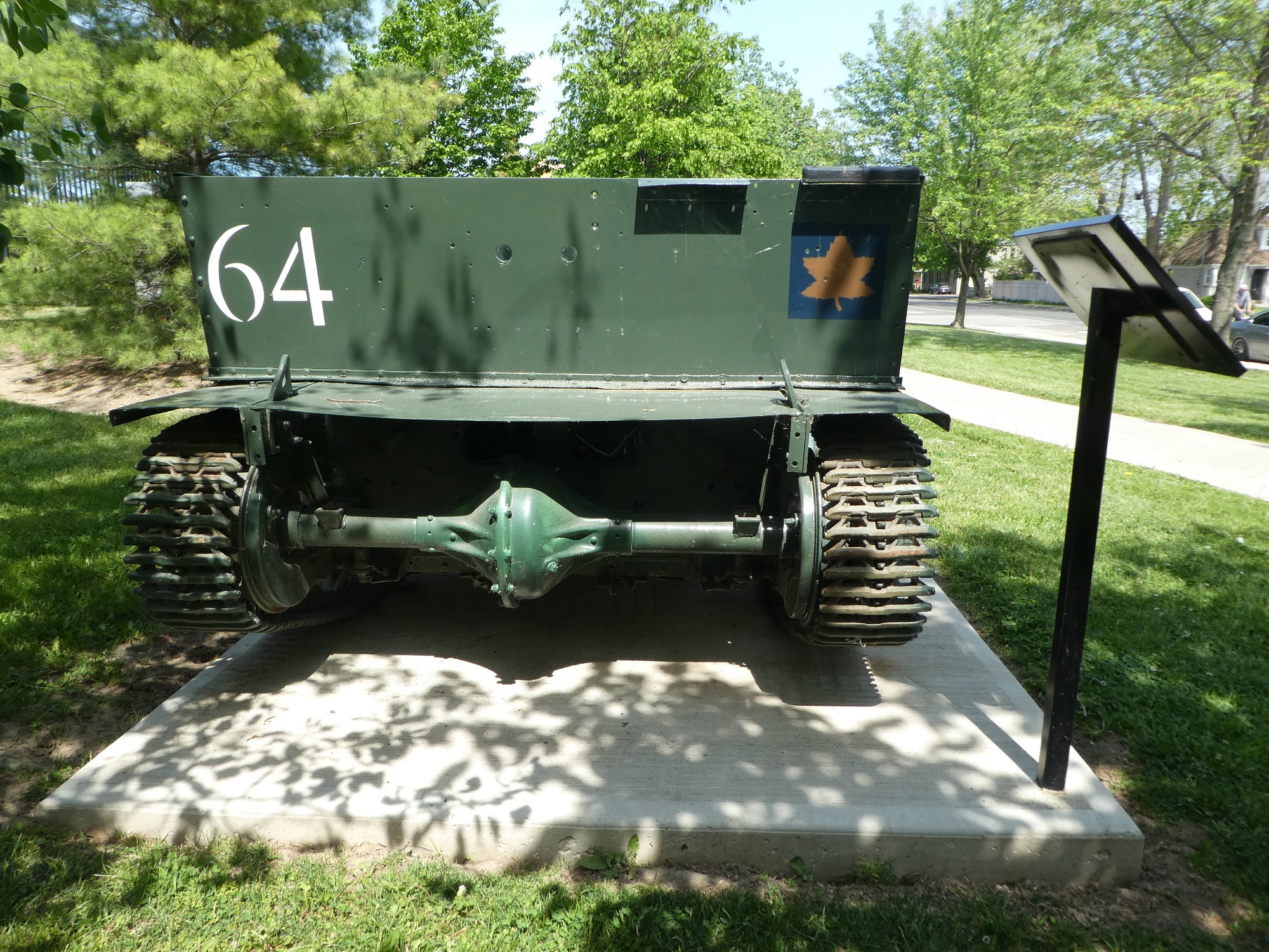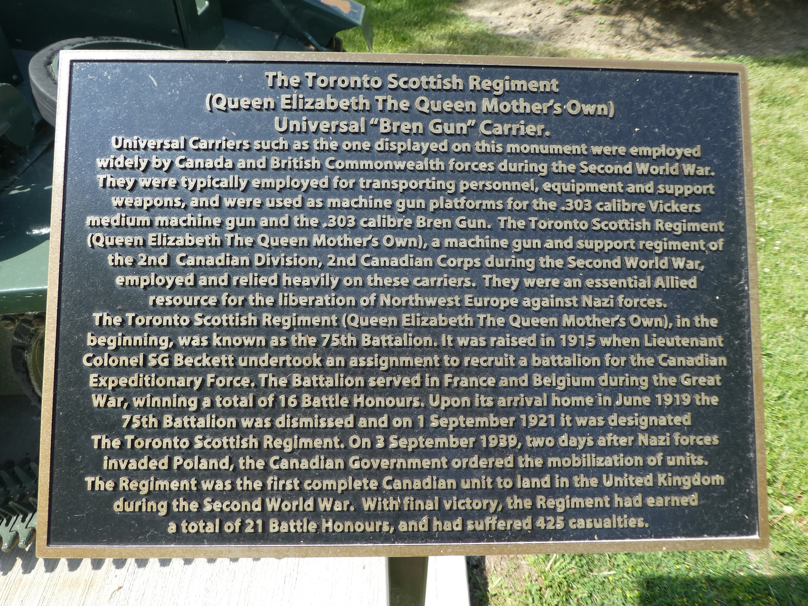Universal Carriers such as the one displayed on this monument were employed widely by Canada and British Commonwealth forces during the Second World War. They were typically employed for transporting personnel, equipment and support weapons, and were used as machine gun platforms for the .303 calibre Vickers medium machine gun and the .303 calibre Bren Gun. The Toronto Scottish Regiment (Queens Elizabeth The Queen Mother's Own), a machine gun and support regiment of the 2nd Canadian Division, 2nd Canadian Corps during the Second World War, employed and relied heavily on these carriers. They were an essential Allied resource for the liberation of Northwest Europe against Nazi forces. The Toronto Scottish Regiment (Queen Elizabeth The Queen Mother's Own), in the beginning, was known as the 75th Battalion. It was raided in 1915 when Lieutenant Colonel SG Beckett undertook an assignment to recruit a battalion for the Canadian Expeditionary Force. The Battalion served in France and Belgium during the Great War, winning a total of 16 Battle Honours. Upon its arrival home in June 1919 the 75th Battalion was dismissed and on 1 September 1921 it was designated The Toronto Scottish Regiment. On 3 September 1939, two days after the Nazi forces invaded Poland, The Canadian Government ordered the mobilization of units. The Regiment was the first complete Canadian unit to land in the United Kingdom during the Second World War. With final victory, the Regiment had earned a total of 21 Battle Honours, and had suffered 425 casualties.