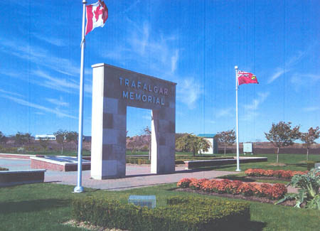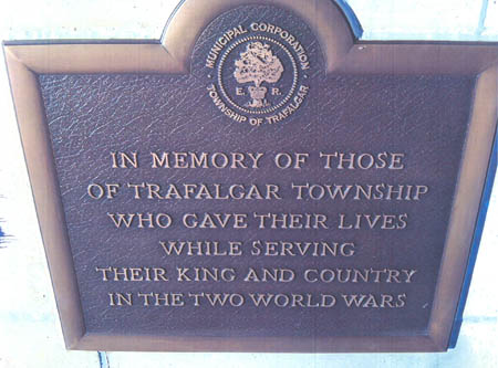 This is the "Trafalgar Memorial". This memorial was erected by the Town of Oakville and unveiled on November 10, 2005. This monument was dedicated to the Veterans of Trafalgar Township who served in World War I, World War II and the Korea War. The memorial is characterized by a large arch, with limestone panels on the front and brick on the back. Much of the building materials were salvaged from a building (now demolished) called "Trafalgar Memorial Hall". The memorial also features a low brick garden wall that pays homage to the original footprint of the old hall (originally located at the SE corner of Trafalgar Road and Dundas Street). There is also an inclined tablet that holds a variety of bronze plaques listing the names of the men and women who served in WWI, WWII, and the Korean War. There is also one replica plaque that was made to replace the original plaque included at the original memorial hall. The tablet dimensions match the size of the opening in the arch and was meant to subtly represent those who had fallen in service. Trafalgar Township originally included most of the area now known as the Town of Oakville, and portions of what is now Milton. Up until 1962, the Town of Oakville was only a very small area at the mouth of the Sixteen Mile Creek.