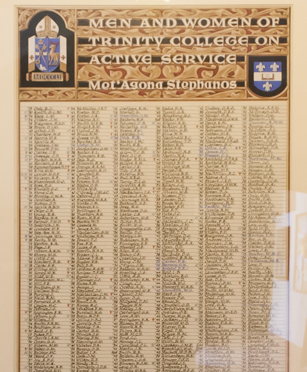 This memorial is dedicated to the men and women of Trinity College who served and those who died while serving their country in the Second World War. It was erected by Trinity College. The lettering on the Honour Roll was completed by hand and done by the artist, Jack McNie about 1942.