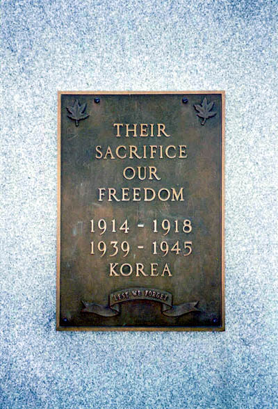 This memorial, erected by the town of Trochu and Royal Canadian Legion Branch No. 98 in 1986, is dedicated to the local war dead and veterans of the First and Second World Wars and the Korean War.